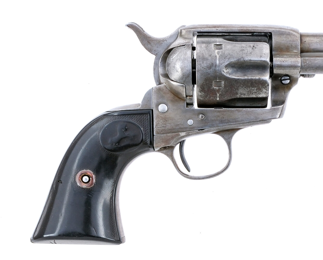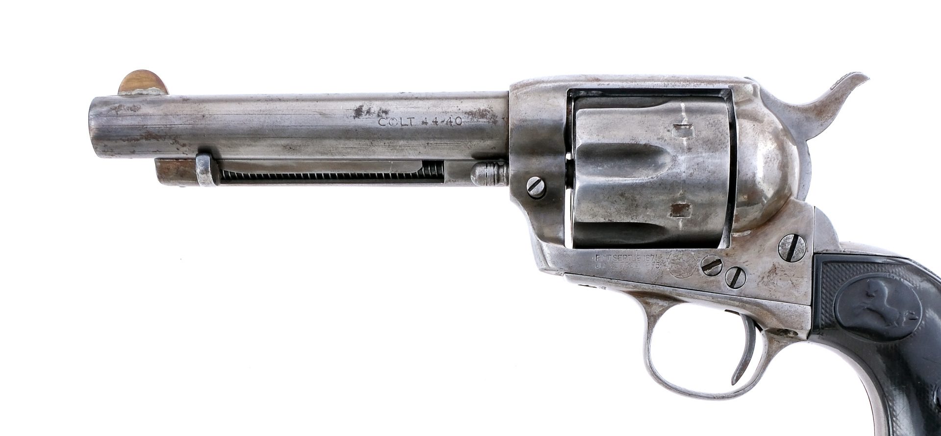Description First Generation Colt Single Action Army chambered in .44-40 Winchester with a six-shot cylinder and a 4 3/4″ barrel. Manufactured in 1906 with serial number 287689. In the white steel finish with hard rubber Rampant Colt grips. Rear notch and coin front blade. The frame, trigger guard frame, butt, and loading gate are serial number matching. Must ship to a FFL or C&R holder. Condition: Fair exhibiting heavy wear and signs of use. The finish is almost completely in the white with signs of being refinished at some point in its life. Buffing marks and faded stampings. Spots and patches of metal oxidation of varying age, color, and size. The ejector rod housing is a little loose. The grips have a repair on the inside, post repair the grips are solid. The checkering and edges of the grips are very worn with some scratches as well. The original front sight has been removed and replaced with a polished half of a coin. The bore is decent, it is pretty bright, but does show spots of metal oxidation throughout. The rifling is fairly strong especially considering the age. Whether this pistol can be safely fired is unknown, but the action does appear to function as expected and is well broken in. Barrel Length: 4 3/4″ Serial: 287689 Manufacturer: COLT Year: 1906 Caliber: .44-40 Winchester Model: Single Action Army Book# 06113