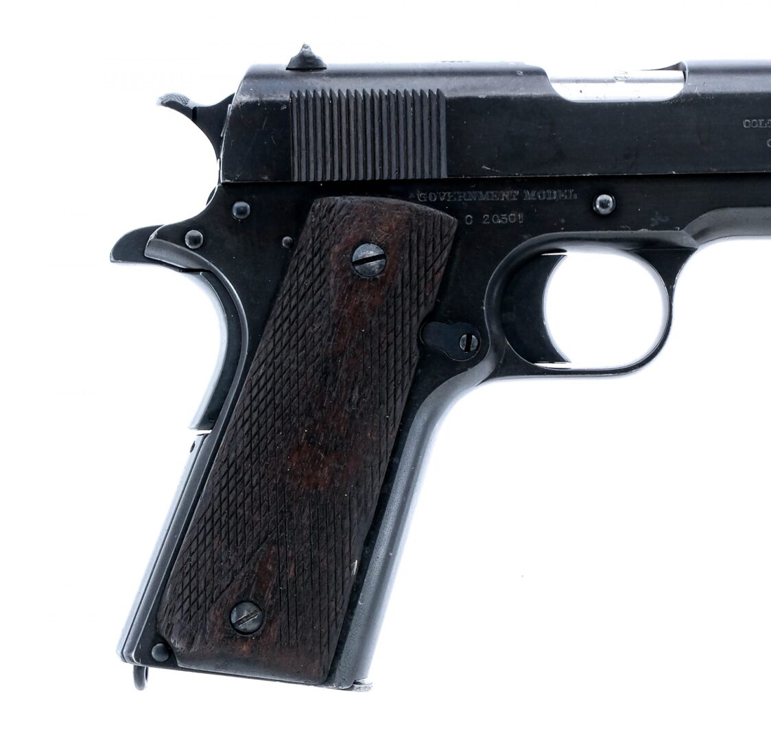 Description Early Argentine Army Procurement Colt Government model chambered in .45 ACP with one, seven round unmarked partial blued magazine and a 5″ barrel. Manufactured in 1915 with serial number C20301. This pistol was part of a 1,000 pistol purchased by the Argentine Army (Ejercito) in 1915, falling the the serial number range C20001 to C21000. The tops of the slides were marked with the Argentine Crest and with numbers 1 to 1000, this one is marked “708”. Argentina designated this pistols as “Pistola Sistema Colt Modelo Argentino 1916, Calibre .45”. Much of this information can be found on pages 139-151 of “Colt .45 Government Models (Commercial Series)” by Charles W. Clawson Colt blued-black finish with checkered wood grips. Smooth mainspring housing with lanyard loop. Single action trigger and hammer. Frame mounted thumb safety and grip safety. The left side of the trigger guard is marked with “R” inspection stamp. The right side of the frame is marked “GOVERNMENT MODEL” “C 20301”. The top of the frame forward of the hammer is marked with “R”. Serrated slide with fixed iron sights. The left side of the slide is marked with two line/two block patent/manufacture markings, with the Rampant Colt on the far end of the slide. The right side of the slide is marked “COLT AUTOMATIC CALIBRE 45”. The barrel is blued with the top of the bolt unfinished. The top of the barrel is marked with matching serial number and diamond shape proof. Must ship to a FFL or C&R holder. Condition: Good/Very good with general scratches, high edge wear, holster wear, and cosmetic handling wear. Varying spots of metal oxidation on the frame and slide. Some spots of finish patina. The grips are solid with the checkering on the grips are worn with some scratches/scuffs. The bore is bright and clean with strong rifling. Barrel Length: 5″ Serial: C20301 Manufacturer: COLT Year: 1915 Caliber: .45 ACP Model: Government Model 1911 Book# 04454
