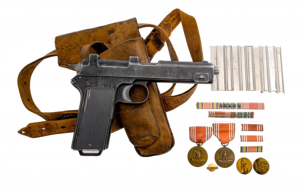 Description Steyr Model 1912 chambered in 9x23mm Steyr with a eight round internal clip fed magazine capacity and a 5″ barrel. Blued steel frame with lanyard loop and clear plastic “sweetheart” grip plates. Serrated manual thumb safety and slide release. Single action trigger and hammer. Blued serrated slide with fixed iron sights. Matching slide and frame with serial number 1376Y. The left side of the slide is marked “STEYR1918”. The right side of the slide is marked “I/8 12”. “K” stamp on the frame, slide, safety, and hammer. “48” and “IR12” marked on the lanyard loop. The right side of the trigger guard is marked “Wr 18”. Comes with ten stripper clips, a leather holster/belt, and a small collection of U.S. Army Ribbons and pins. Two, Army Good Conduct Medals one unmarked and the other to Charles S Miller. Four Army Good Conduct ribbons, one with good conduct loop. Two European–African–Middle Eastern Campaign Medals, both with five service stars. Two WW2 Victory ribbons. And lastly collar insignia, one U.S. and the other is Enlisted Ordnance Collar Insignia. Must ship to a FFL or C&R holder. Condition: Good/Very Good with scratches/scuffs, sharp edge wear, and normal finish wear from handling, operation, and age. Some small spots of finish loss. light spots and speckling of metal oxidation. Bright bore with strong rifling. Barrel Length: 5″ Serial: 1376Y Manufacturer: STEYR ARMS (STEYR MANNLIC Year: 1918 Caliber: 9x23mm Steyr Model: M1912 Book# 02987