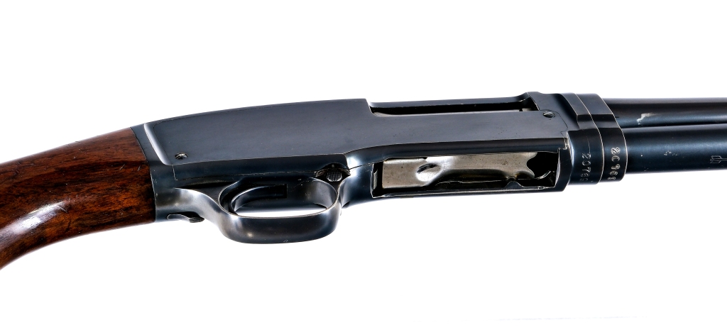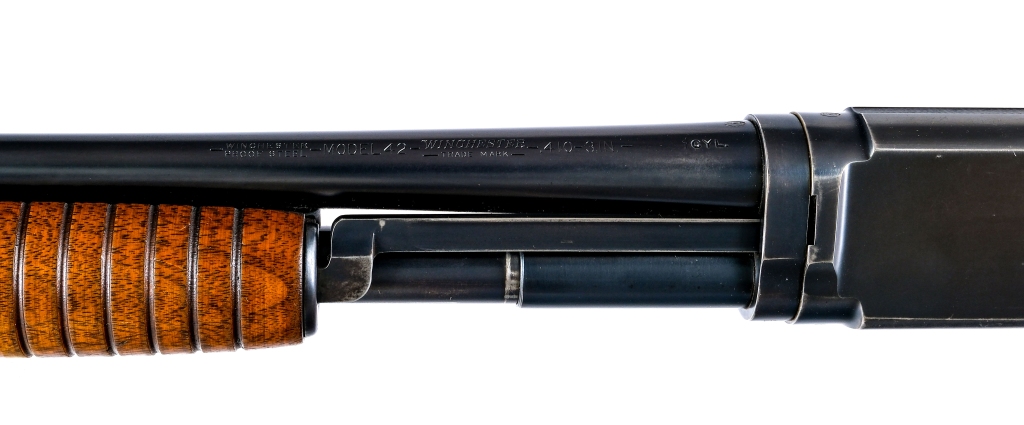 Description Winchester model 42 chambered in .410 Bore for 3″ shells with a five round tube magazine and a 26″ barrel. Manufactured in 1936 with serial number 20769. The bore has a fixed cylinder choke. Blued barrel, magazine tube, receiver, trigger, and trigger guard. Cross bolt safety and push button action release. Silver bead front sight. Ribbed wood forend and smooth pistol grip stock with black butt plate. Must ship to a FFL or C&R holder. Condition: Very good with light scratches, contact marks, and handling wear. Some finish wear on the sharp edges, and normal operational wear on the contact points/moving parts. Some light scratches and dings on the wood. Bright and clean smooth bore. Barrel Length: 26″ Serial: 20769 Manufacturer: WINCHESTER Gauge: .410 Year: 1936 Model: 42 Book# 07539