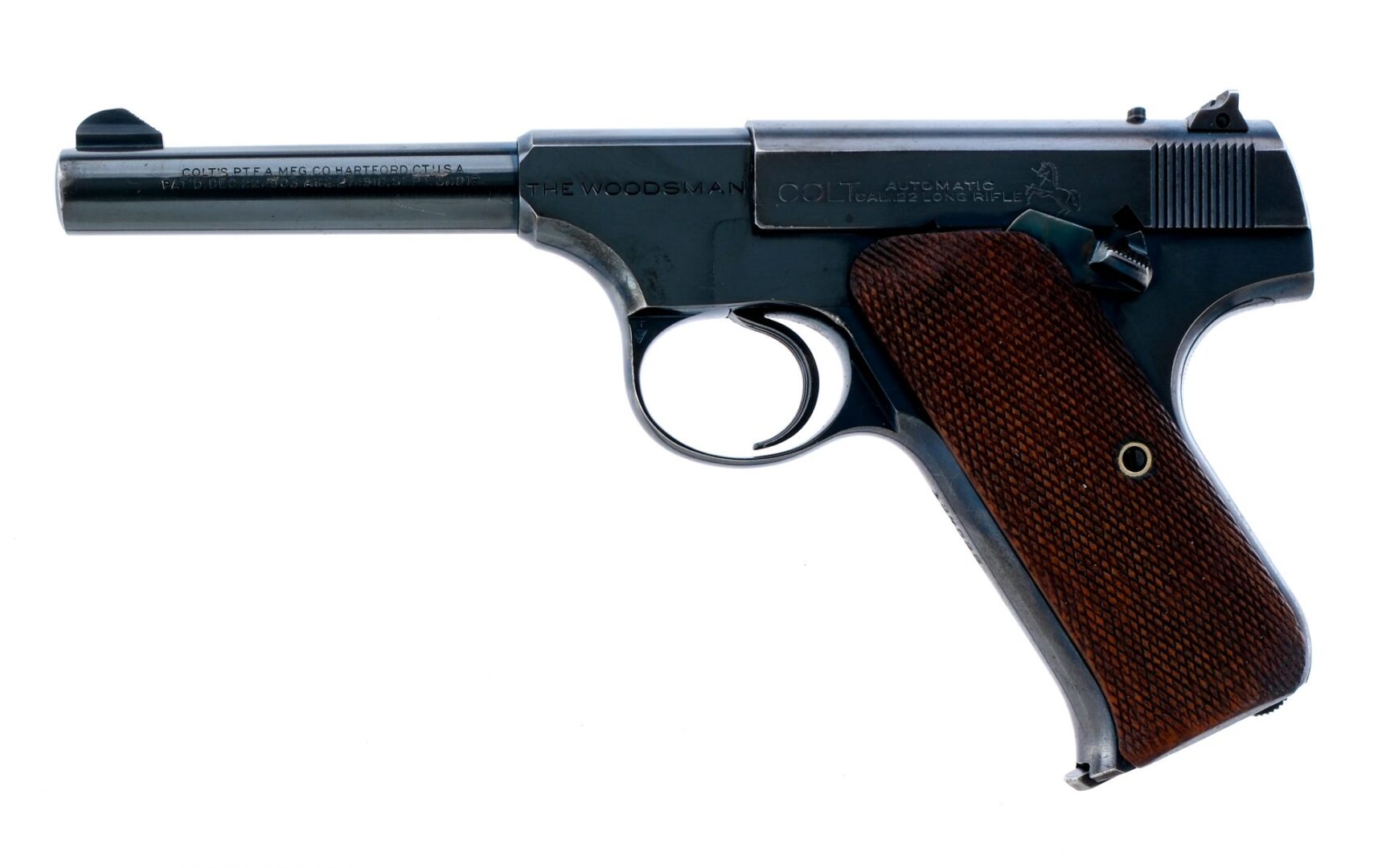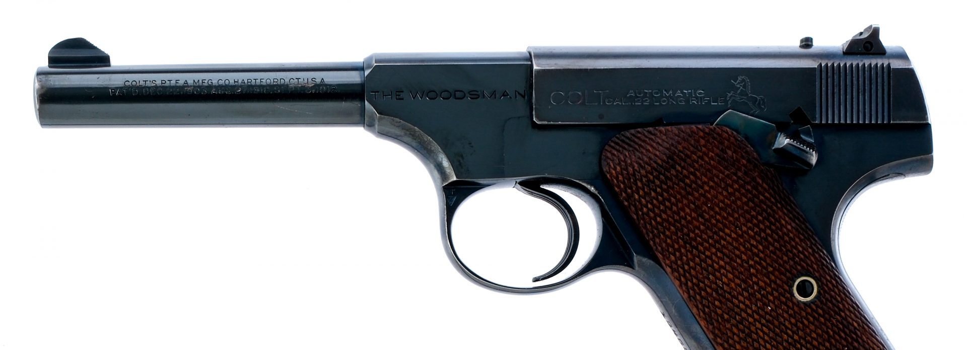 Description UPDATE: The right lower grip plate has a small piece of the wood missing. Colt Woodsman chambered in .22 long rifle with one, ten round removable magazine and a 4.5″ barrel. Manufactured in 1939 with serial number 134535. Blued steel frame with checkered wood grips. Serrated heel magazine release and serrated trigger. Case colored frame mounted manual thumb safety. Blued barrel and serrated slide with fixed front blade and rear notch iron sights. The left side of the trigger guard is marked with “P” Proof mark over VP” Verified Proof. The right side of the trigger guard is marked with “30” assemblers proof. Come with its factory period correct box with matching barrel length and model. Also comes with factory test target and shooting suggestions card. Must ship to a FFL or C&R holder. Condition: Very good with some scratches, chatter marks, and high edge wear from normal handling. Light patina on the front strap. Some specks of metal oxidation. Some light wear on the grips/checkering. Bright and clean bore with strong rifling. Barrel Length: 4.5″ Serial: 134535 Manufacturer: COLT Year: 1939 Caliber: .22 Long Rifle Model: Woodsman Book# 05497