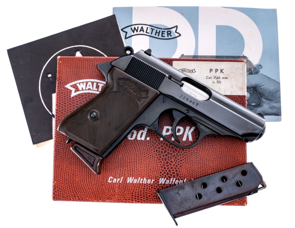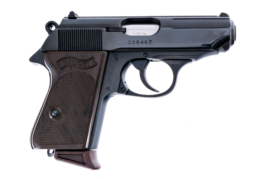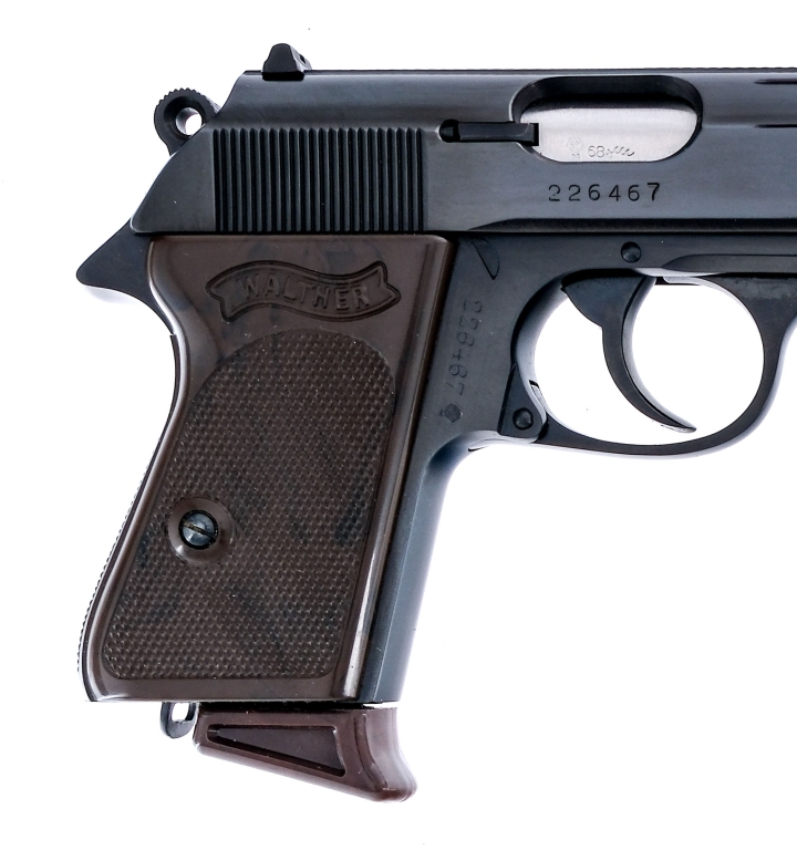 Description West German Walther PPK chambered in 7.65mm (.32 ACP) with two, seven round magazines and a 3.3″ barrel. Manufactured in 1968, marked on the barrel. Blued steel frame with checkered brown polymer Walther grips. Frame mounted lanyard loop. Push button magazine release. Double/single action trigger and hammer. Blued serrated slide with fixed iron sights. Slide mounted de-cocker/safety lever. The left side of the frame is marked “Made in West-Germany”. The left side of the slide is marked “Carl Walther Waffenfabrik Ulm/Do. Modell PPK Cal 7,65 mm”. Eagle over N proofs on the slide, frame, and barrel. Comes in its factory serial number matching box with paperwork, cleaning rod/brush, and two magazines Must ship to a FFL or C&R holder. Condition: Like new in box, appears to have been used very little if at all. Bright and clean rifled bore. Barrel Length: 3.3″ Serial: 226467 Manufacturer: WALTHER Year: 1968 Caliber: .32 ACP Model: PPK Book# 07409