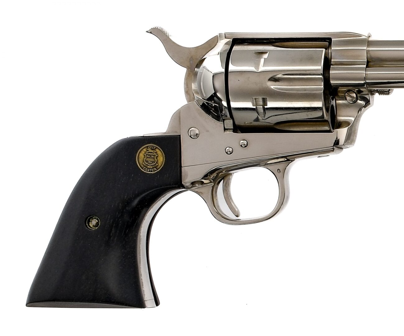 Description Colt Single Action Army 2nd Generation chambered in .45 Colt with a six-shot cylinder and a 7.5″ barrel. Manufactured in 1970 with serial number 58122SA. Nickel finished barrel, frame, fluted, cylinder, single action trigger, hammer, screws, and other small parts. Smooth wood grips with Colt Custom shop medallions. Fixed blade front sight. Comes in its factory box with matching caliber/barrel length and an extra set of smooth wood grips. Must ship to a FFL or C&R holder. Condition: Very Good with normal scratches and finish wear from handling and storage. A small amount of small light specks of metal oxidation. Light operational wear such as a cylinder turn line. Clean rifled bore. Barrel Length: 7.5″ Serial: 58122SA Manufacturer: COLT Year: 1970 Caliber: .45 Colt Model: SAA 2nd Gen Book# 02295