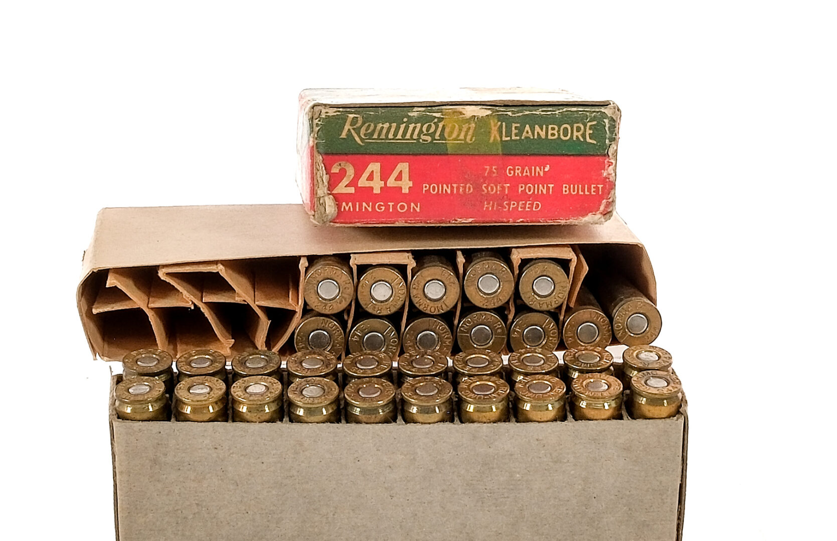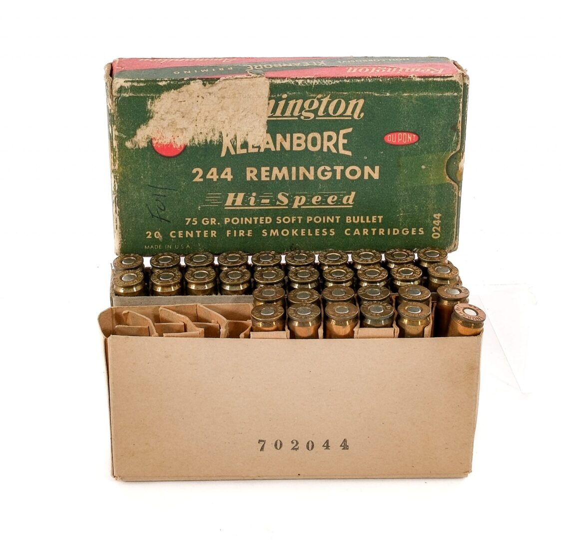 Description Estate lot with fifty two rounds of .244 Remington. One full box of twenty unfired rounds by Remington Kleanbore. Twelve unfired rounds of Norma .244. Fourteen rounds by Peters in .244 Rem. Six unfired rounds by Remington UMC in .244 Rem. Fifty two unfired assorted rounds. Ships to MOST buyers homes. Sold AS-IS. Condition: New Old Stock, with oxidation, box damage and handling wear. Manufacturer: Norma Remington UMC Caliber: .244 Rem