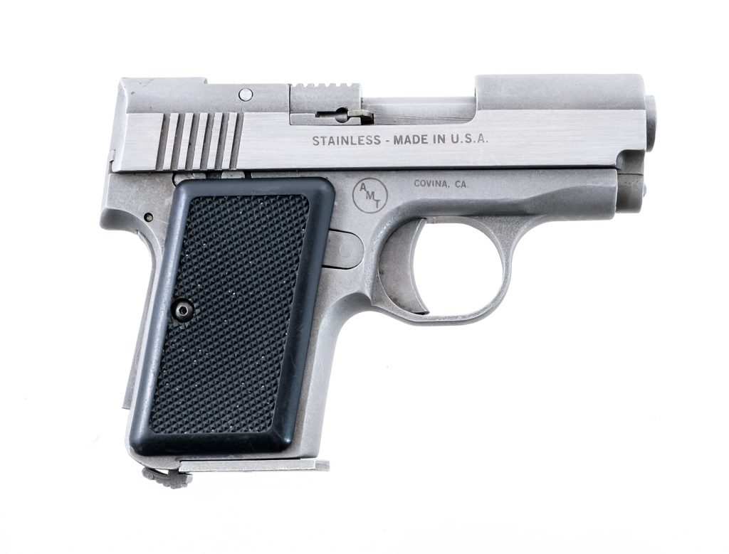 Description AMT Backup chambered in .22 long rifle with one, eight round removable magazine and a 2 3/4″ barrel. This direct blowback pistol has a gray/silver metal frame with a stainless serrated slide. Polymer checkered grips, left side located safety lever, backstrap depression safety, and heel magazine release. Trench fixed sights. Must ship to FFL holder. Condition: Very good/Excellent with light handling wear and a clean rifled bore. Barrel Length: 2 3/4″ Serial: F06025 Manufacturer: AMT (ARCADIA MACHINE & TO Caliber: .22 Long Rifle Model: Backup .22 Book# 8-684