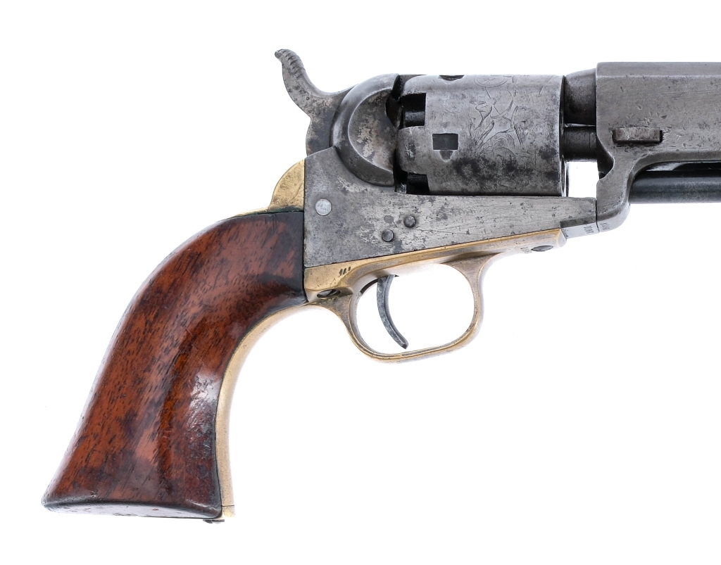 Description Colt 1849 Pocket chambered in .31 Caliber with a five-shot cylinder and a 4″ octagonal barrel. Manufactured in 1855 with serial number 100697. In the white barrel, engraved cylinder, single action trigger, and hammer. The cylinder shows Stagecoach scenes. Blued ram rod. Brass trigger guard and grip frame. Smooth wood grips. Rear hammer notch and front bead iron sights. Serial number matching barrel, frame, cylinder, trigger guard, and grip frame. The top of the barrel is marked “ADDRESS SAM L COLT NEW YORK CITY”. COLTS PATENT is marked on the frame and cylinder. Antique, ships directly to buyers home in MOST states. Condition: Antique Good with scratches, sharp edge wear, and general cosmetic handling wear. Most of the finish is in the white with spots of patina and metal oxidation/pitting. Spots of tarnish and finish loss on the brass. Some light scratches and dings on the grips. Some spots of metal oxidation in the bore, shows strong visible rifling. Barrel Length: 4″ Serial: 100697 Manufacturer: COLT Year: 1855 Caliber: .31 Caliber Model: 1849 Pocket