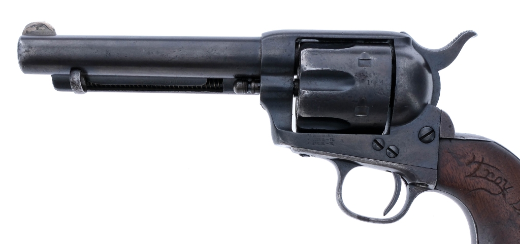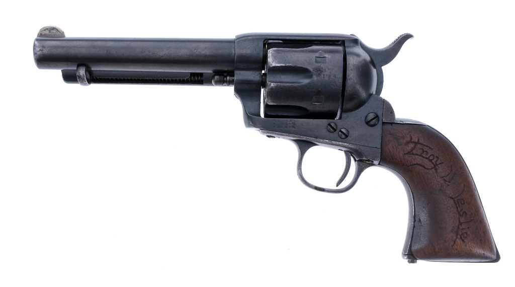 Description 1st Generation Colt Single Action Army chambered in .44 Center Fire with a six-shot cylinder and a 5 1/8″ barrel. The barrel has been shortened from 5 1/2″ at some point. Manufactured in 1883 with serial number 98355. Reblued finish with smooth wood grips. Single action trigger and hammer. Rear notch and front blade sight replaced with a cut and buffed coin. The left side of the grips is carved with “Troy L. Leslie”. The frame and trigger guard are serial matching with 98355. The cylinder has been replaced and has serial 1584. Antique ships directly to buyers home, in MOST states. Condition: Antique Fair having been fully reblued with visible pitting, wear, and buffing under the finish. Scratches, metal contact marks, sharp edge wear, and general cosmetic handling wear. Spots of metal oxidation/patina. Scratches and dings on the wood. Wood repair and carving in the grips. The bottom front of both grips are missing small chunks and have been sanded and rounded off. The barrel has been shortened and the front sight has been replaced with a coin that is slightly crooked. The bore is decently bright but does show spots of metal oxidation. Strong visible rifling. The action functions and is reasonably tight, but with enough force the cylinder can be rotated when the hammer is locked. Barrel Length: 5 1/8″ Serial: 98355 Manufacturer: COLT Caliber: .44-40 Winchester Model: Single Action Army 1st Gen