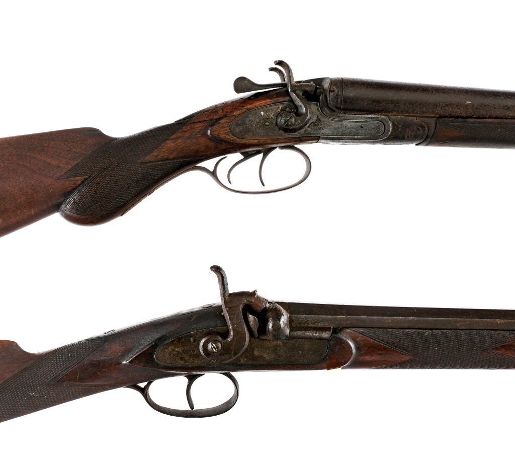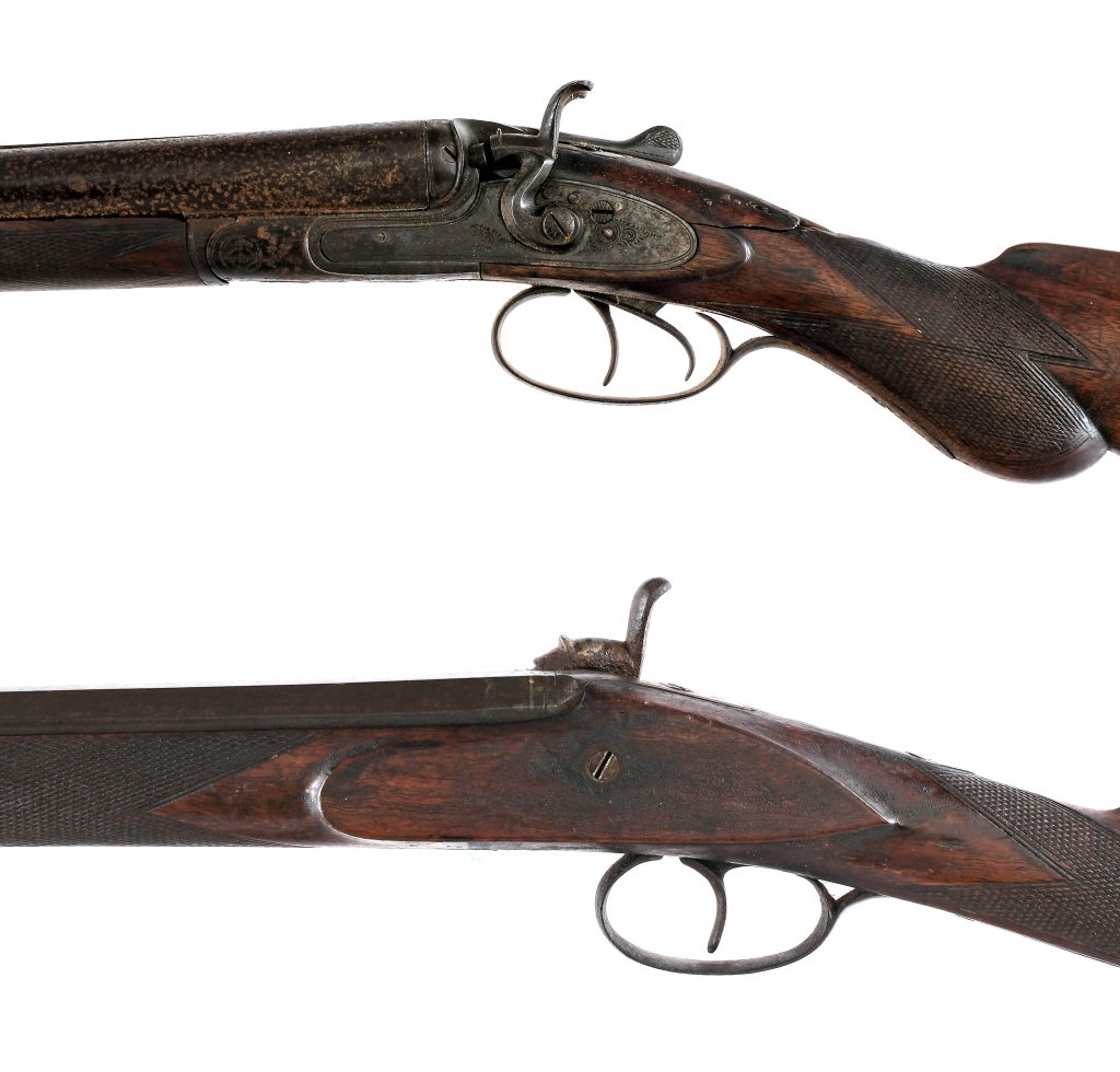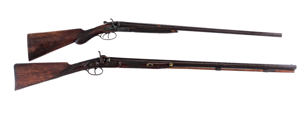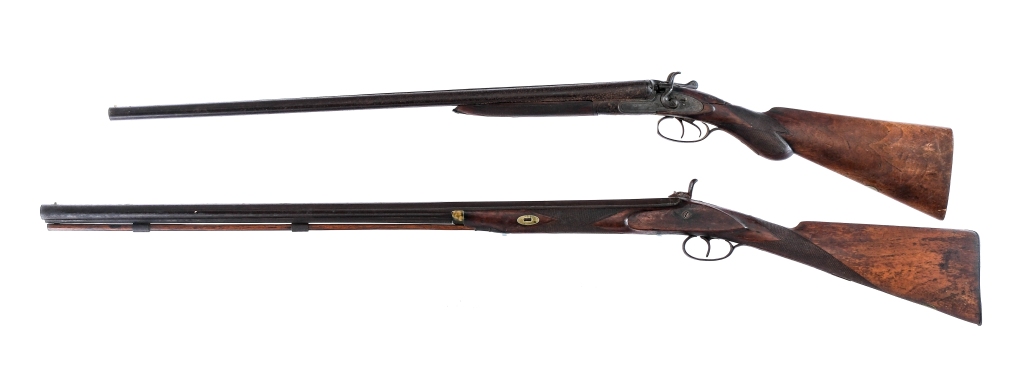 Description This lot is for antique long guns. First is a lightweight percussion rifle of an unknown make with a 32″ laminated steel barrel. The bore measures to around 16.6mm, likely around 65 caliber. Patinated blued finish. Front cleaning rod. Checkered forend and straight grip stock. Bead front sight. The second is a Joseph Manton hammered side by side shotgun chambered in 16 gauge with 27.5″ barrels. Double triggers. Patinated blued finish. Checkered wood forend and pistol grip stock. Bead front sight. Antiques, ships directly to buyers home in MOST states. Condition: Poor with heavy metal oxidation, patina, and pitting. Scratches, scuffs, dings, cracks, and wear on the wood. The rifles hammer and trigger does not work and the nipple is deformed. The shot guns left hammer and trigger function but the right does not function. Dark and rusty smooth bore. SOLD AS-IS. Barrel Length: 32″ 27.5″ Serial: 13207 Manufacturer: J.Manton, Unknown Gauge: 16 Ga. Caliber: 16.6mm Model: Percussion Rifle, SxS