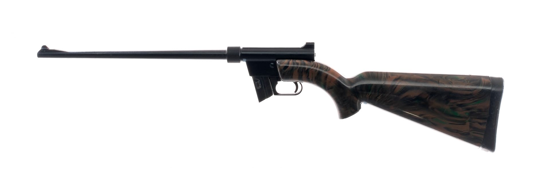Description Armalite AR-7 Explorer in .22 Long Rifle with two removable magazines and a 16″ barrel. Serrated composite butt plate. Camouflage pattern composite stock. Black finished metal receiver and barrel. Inside trigger guard serrated magazine release. Right side of receiver charging handle and safety switch. Front and rear fixed sights. Rifle breaks down at the rear of barrel and underside of pistol grip then stores inside the stock. Comes with one ten round and one twenty five round removable magazine. Must ship to a C&R or FFL holder. Condition: Good/Very Good with scratches, dings and handling wear. Clean rifled bore. Barrel Length: 16″ Serial: 76253 Manufacturer: Armalite Caliber: .22 LR Model: AR 7 Explorer Year-Range 1959-1973 Book# 02203