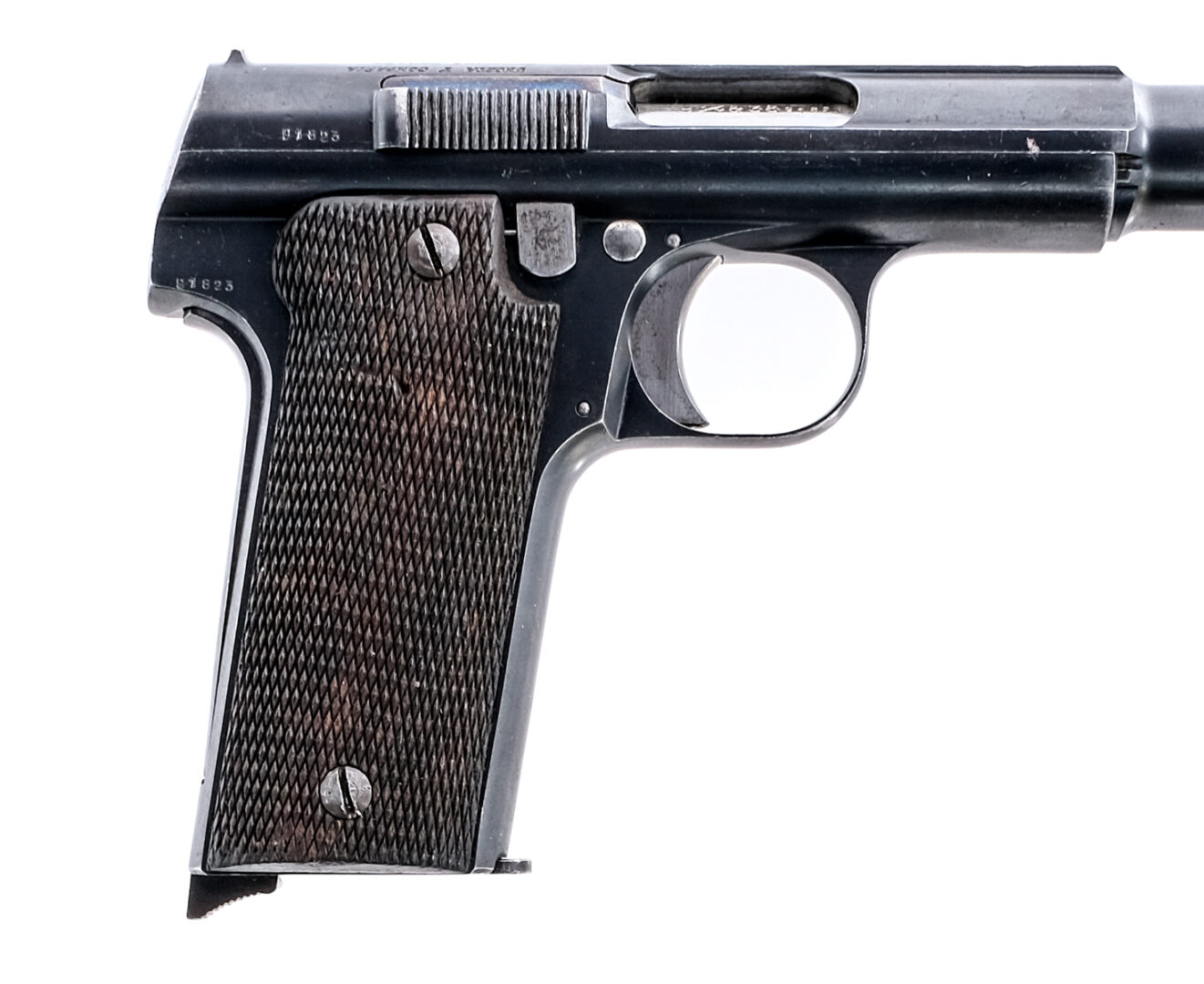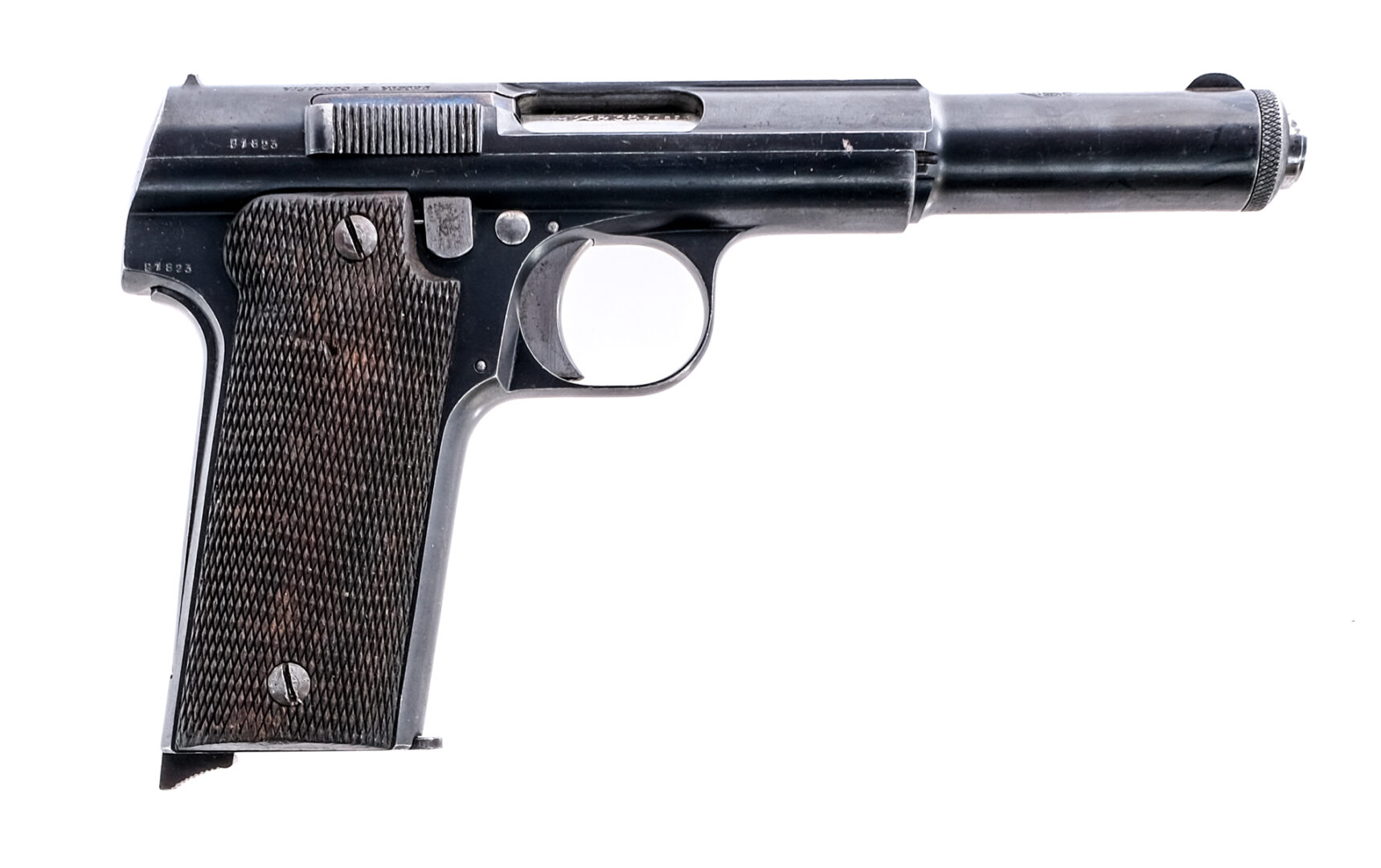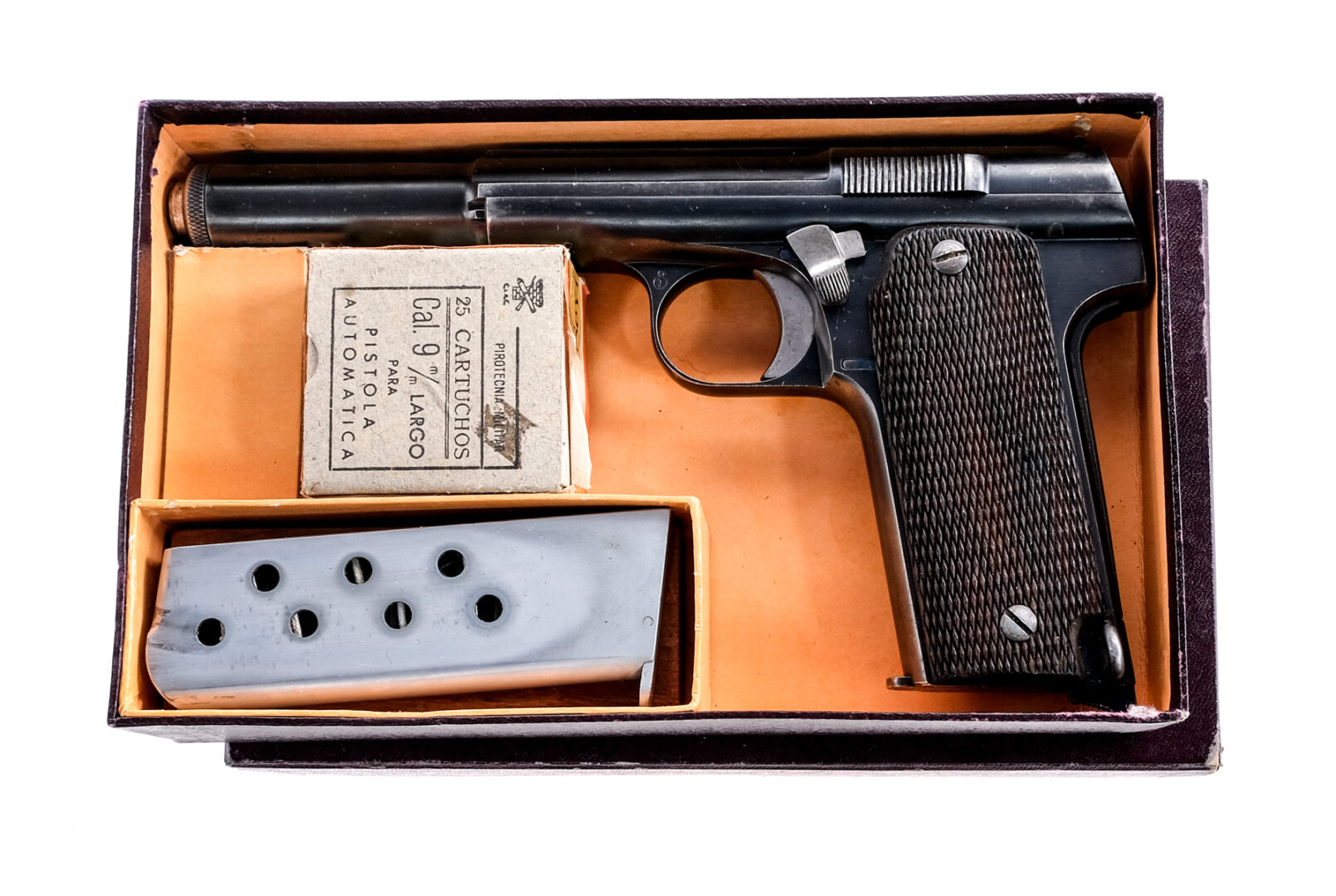 Description Astra Model 1921 (400) in 9mm Largo with two, eight round removable magazines and a 6″ barrel. Checkered wood grip plates. Blued frame and serrated slide. Solid trigger. Magwell located serrated magazine release and lanyard loop. Left side of frame serrated safety switch. Backstrap safety. Front and rear fixed sights. Comes in a factory box with cleaning rod, one blued magazine, one nickel finished, instruction sheet and box of twenty five unfired rounds in 9mm Largo marked 1948. Ammunition ships separately. Must ship to a C&R or FFL holder. Condition: Good/Very Good with light scratches, finish wear/loss and wood dings. Clean rifled bore. Barrel Length: 6″ Serial: 91823 Manufacturer: Astra Year: 1936 Caliber: 9mm Largo Model: 1921 400 Book# 00525