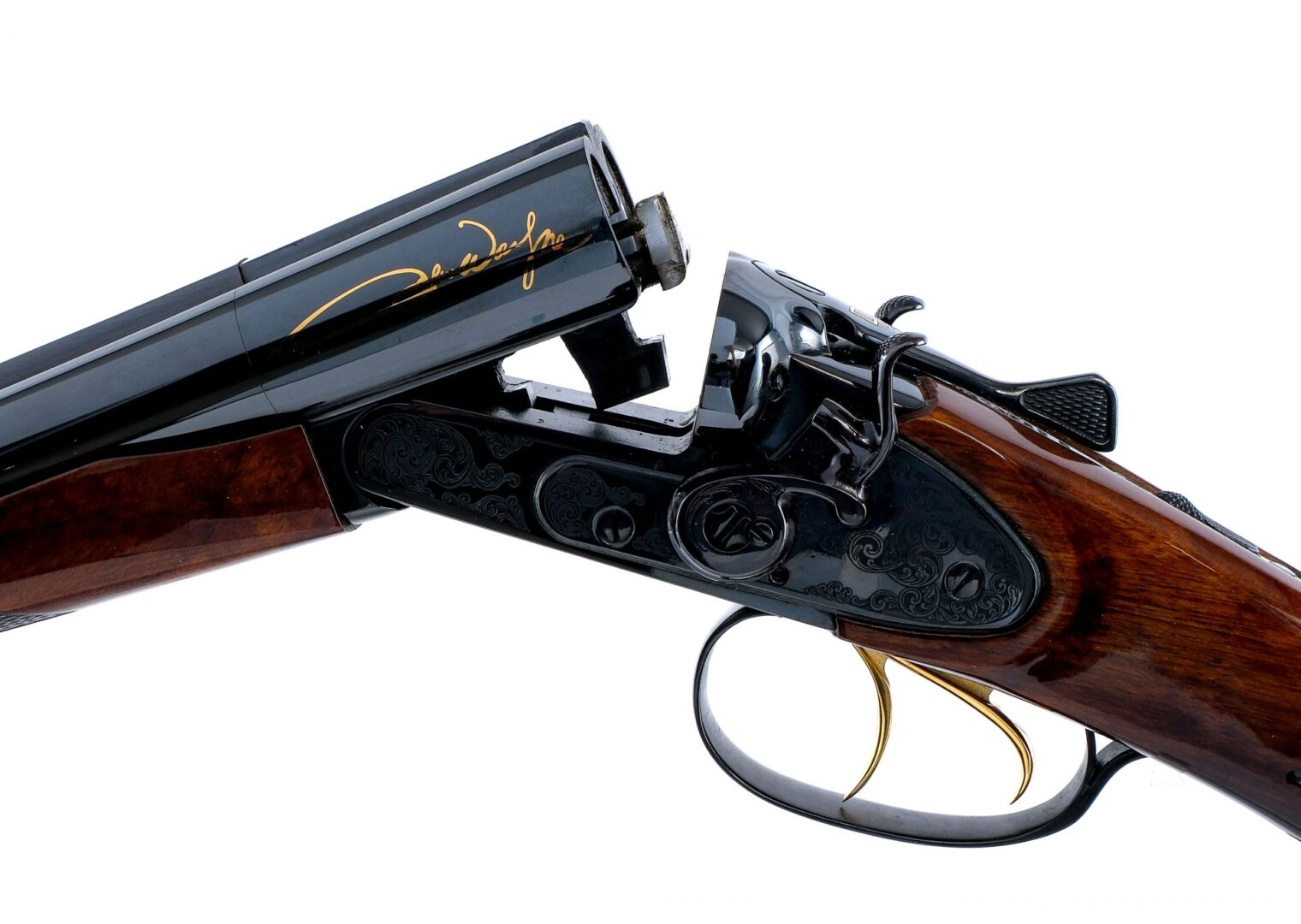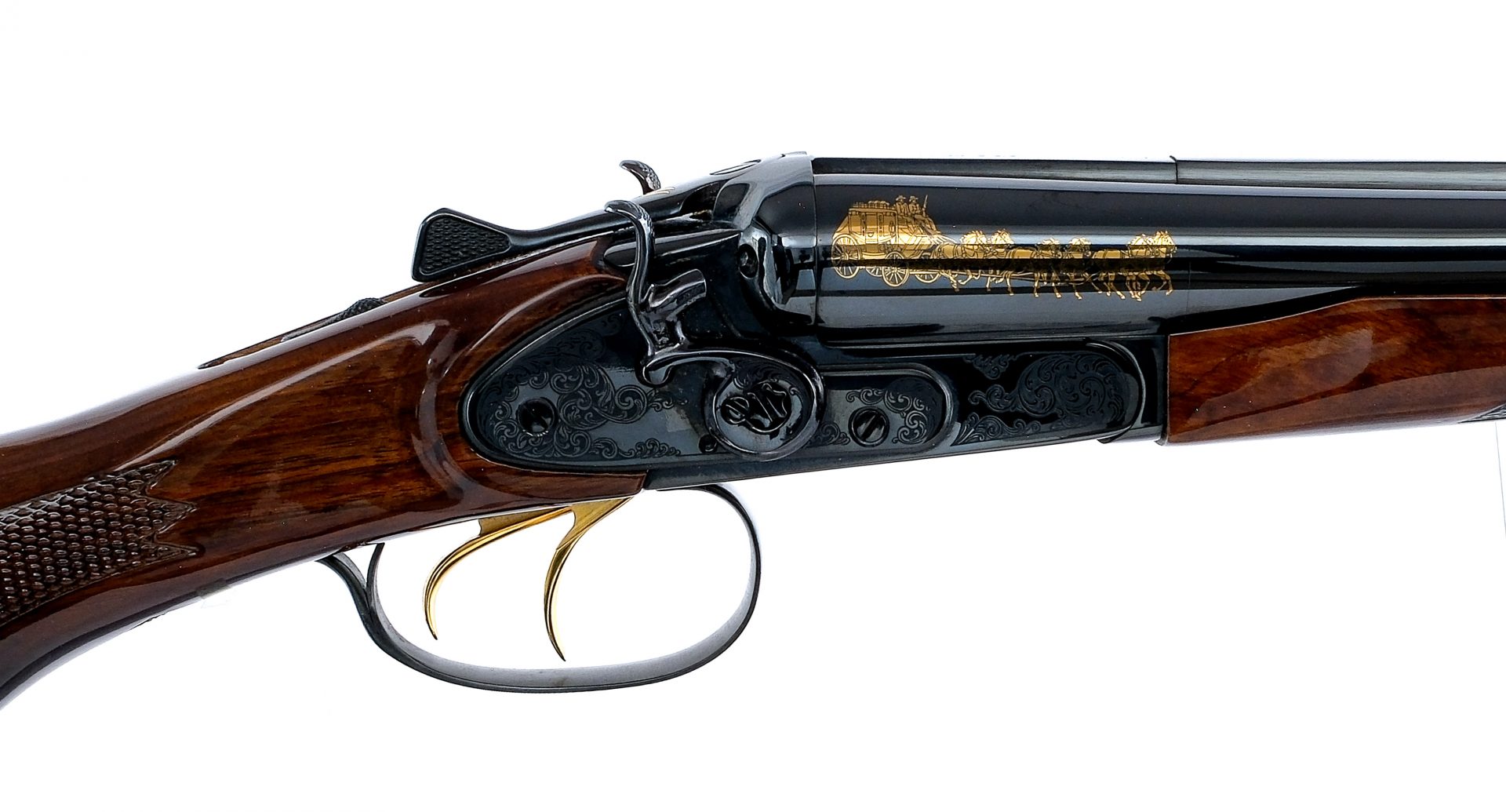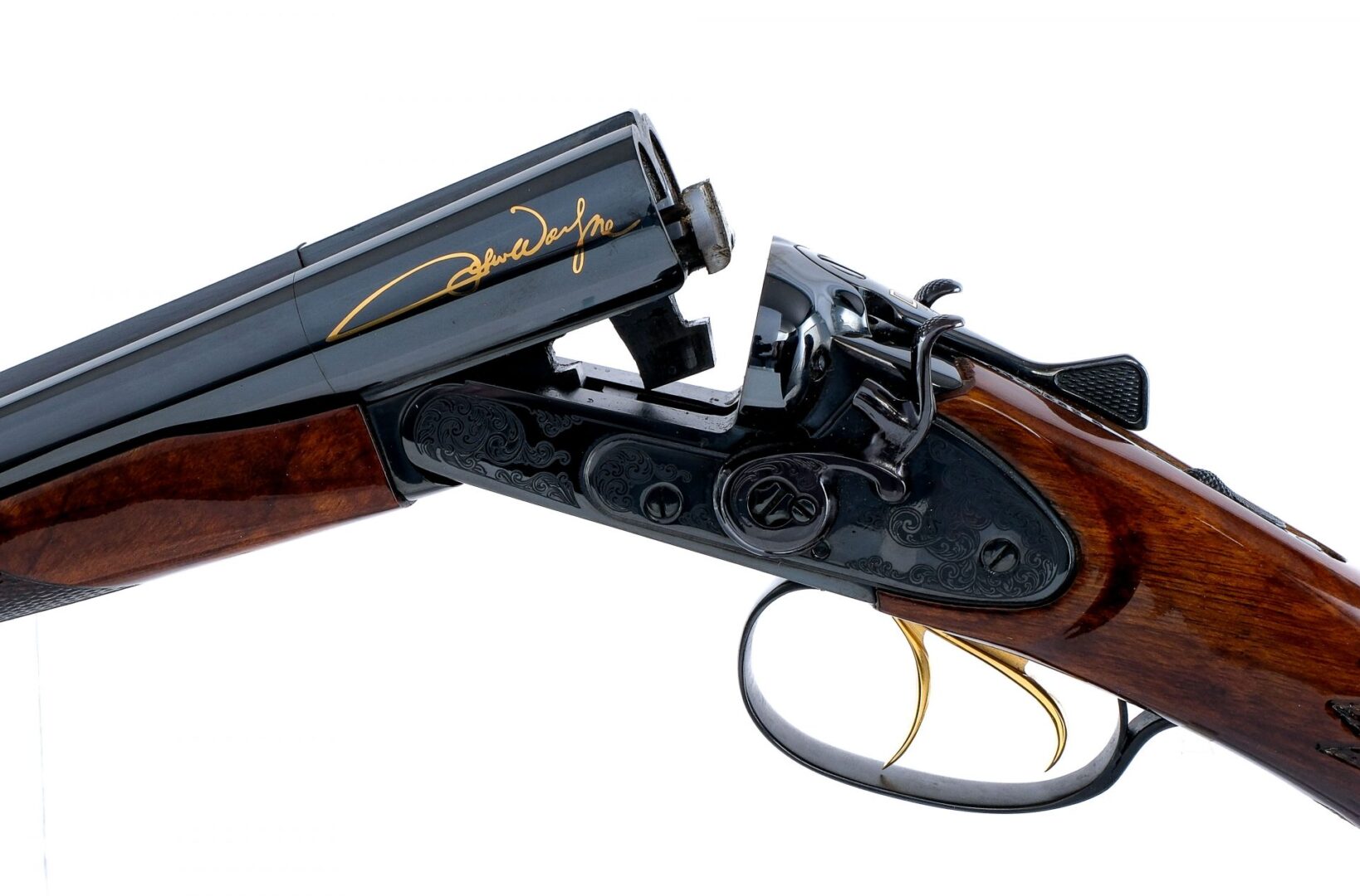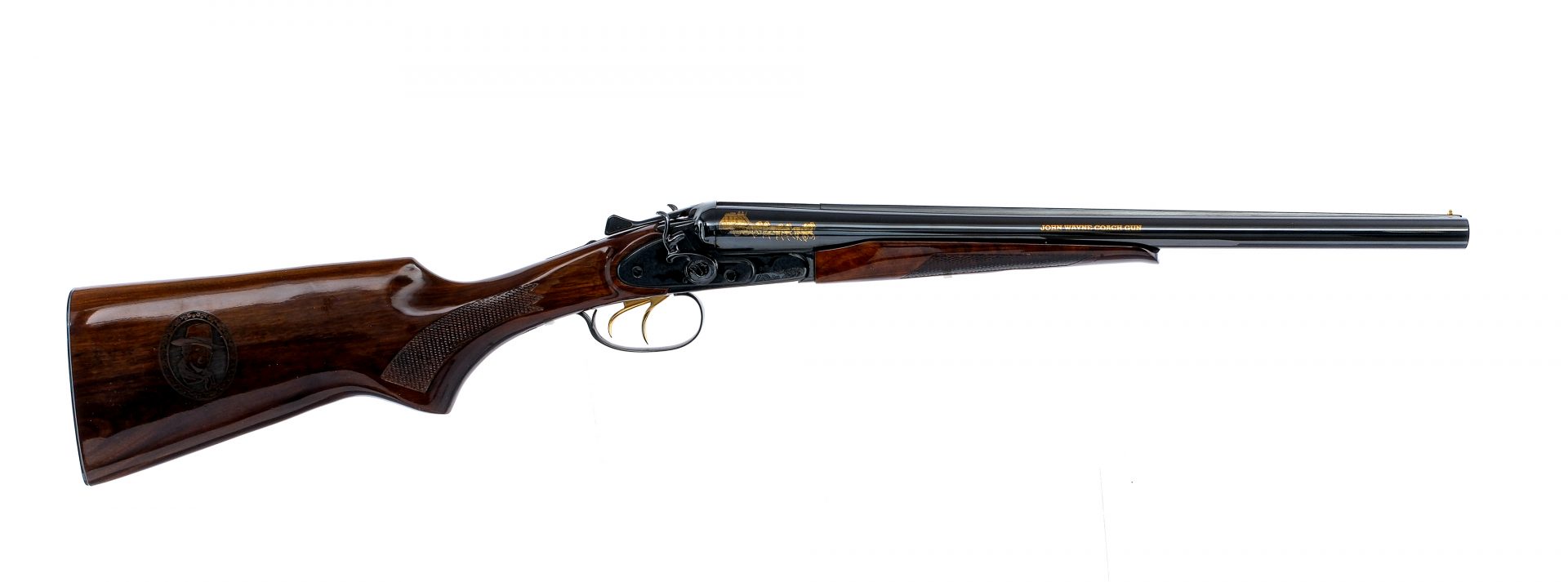 Description America Remembers United States Society of Arms and Armor John Wayne Coach Gun Commemorative, manufactured by Baikal using a IZH43K chambered in 12 gauge for 2 3/4″ shells with 18.5″ side by side double barrels. Both of the barrels have fixed Improved Cylinder chokes. Manufactured in Russia by Baikal and imported by EAA Corp, marked on the bottom of the barrels. Glossy blued barrels, engraved lock, engraved hammers, lever, and trigger guard. Gold plated double triggers. Tang mounted safeties. The left side of the barrel is marked “I Won’t Be Wronged, I Won’t be Insulted” and John Wayne’s signature in gold. The top of the barrel is marked America Remembers United States Society of Arms. The right side of the barrel is marked “JOHN WAYNE COACH GUN” and with horse and wagon imaged in gold. Checkered and glossy wood handguard and pistol grip stock with John Wayne carving on the right side of the stock. Blued and engraved butt plate. Comes in a black hard case with factory manual/paperwork, John Wayne 12ga wall mounts, white gloves, and America Remembers long gun sleeve. Must ship to a FFL holder. Condition: Like new with very light wear from handling/storage. Appears to be unfired or used very little. Clean smooth bores. Barrel Length: 18.5″ Serial: JW1103 Manufacturer: BAIKAL Gauge: 12 Ga. Model: IZH1103 John Wayne Coach Gun Book# 04638