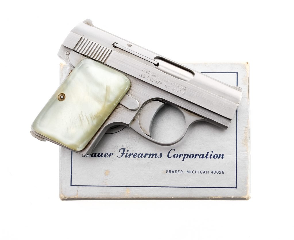 Description Bauer Automatic (Baby Bauer) chambered in .25 ACP with one, six round removable magazine with a 2″ barrel. Faux pearl grip plates. Stainless steel frame, serrated slide and smooth trigger. Fixed iron sights. Left side of frame located serrated safety switch. Comes in factory box. Must ship to FFL holder Condition: Very good/Excellent with light scuffs and handling wear. Very clean rifled bore. Barrel Length: 2″ Serial: 180418 Manufacturer: BAUER FIREARMS CORPORATIO Caliber: .25 ACP Model: Bauer Automatic Baby Year-Range 1972-1984