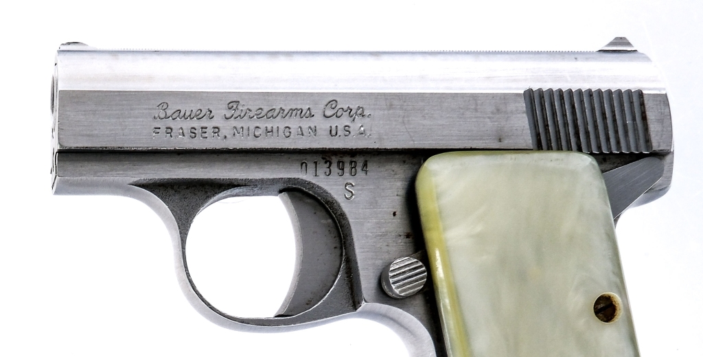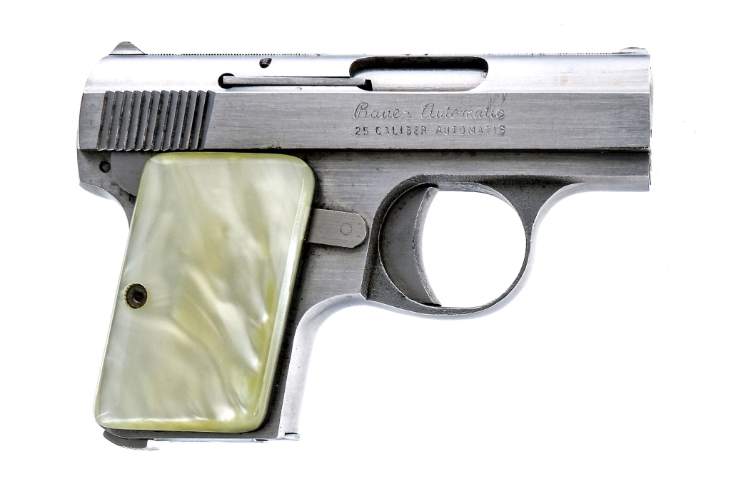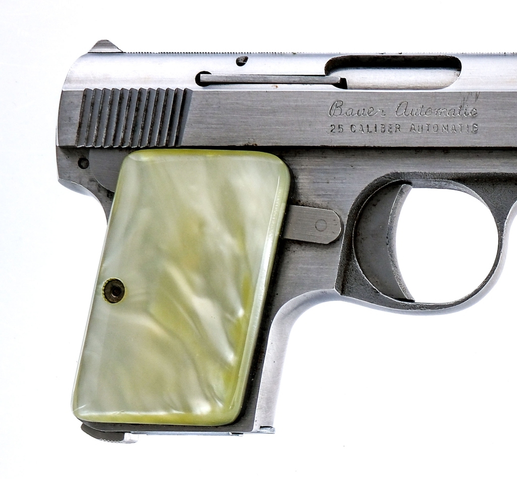 Description Bauer Automatic ( Baby Bauer ) chambered in .25 ACP with one, six round removable magazine and a 2″ barrel. Faux pearl composite grip plates. Stainless steel frame, serrated slide and smooth trigger. Fixed iron sights. Left side of frame located serrated safety switch. Comes in its factory soft zipper case. Must ship to FFL holder. Condition: Good with light scuffs, touches of rust and handling wear. Clean rifled bore. Barrel Length: 2″ Serial: 013984 Manufacturer: Bauer Caliber: .25 ACP Model: Automatic Baby Bauer Book# 08522