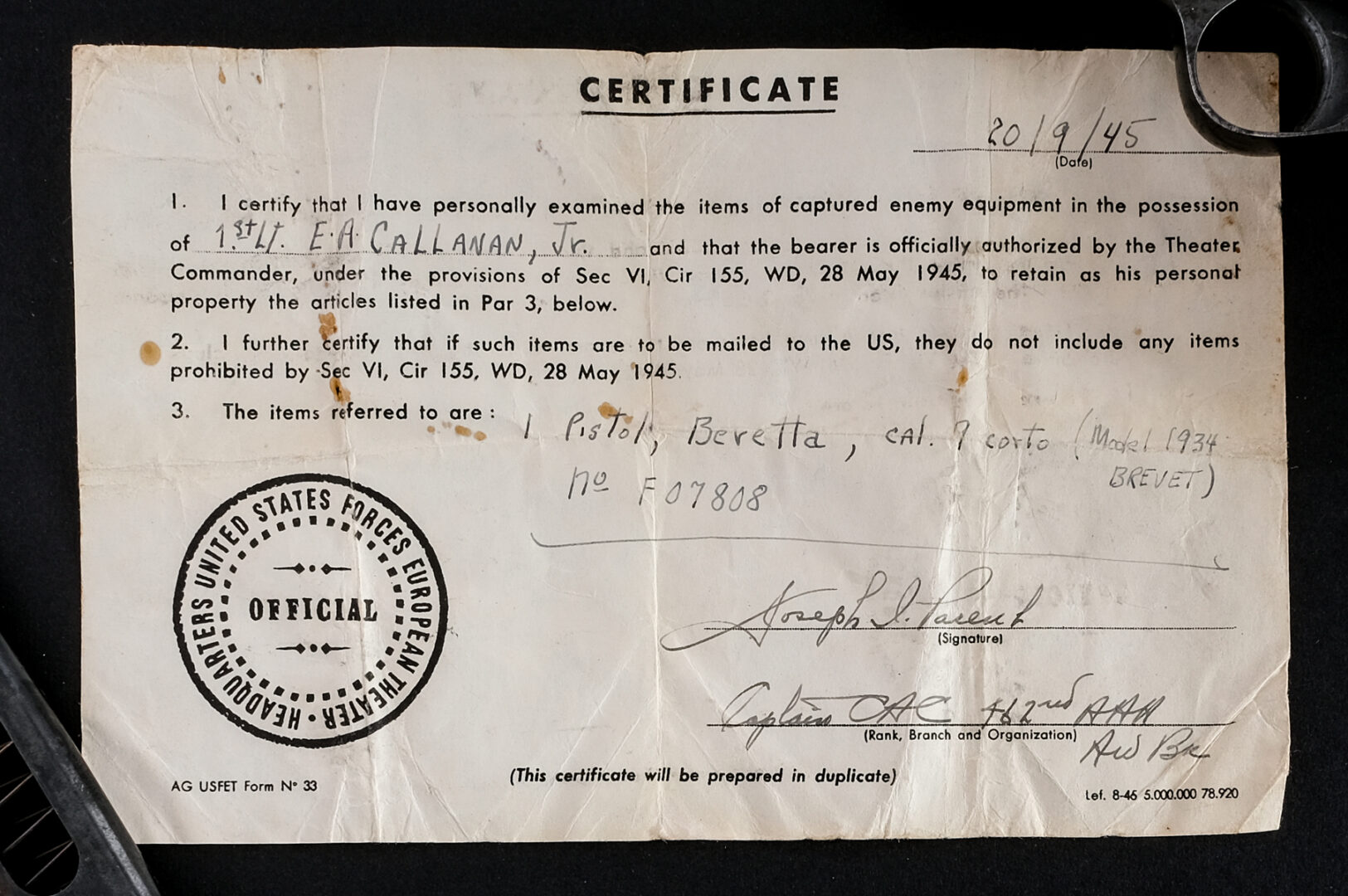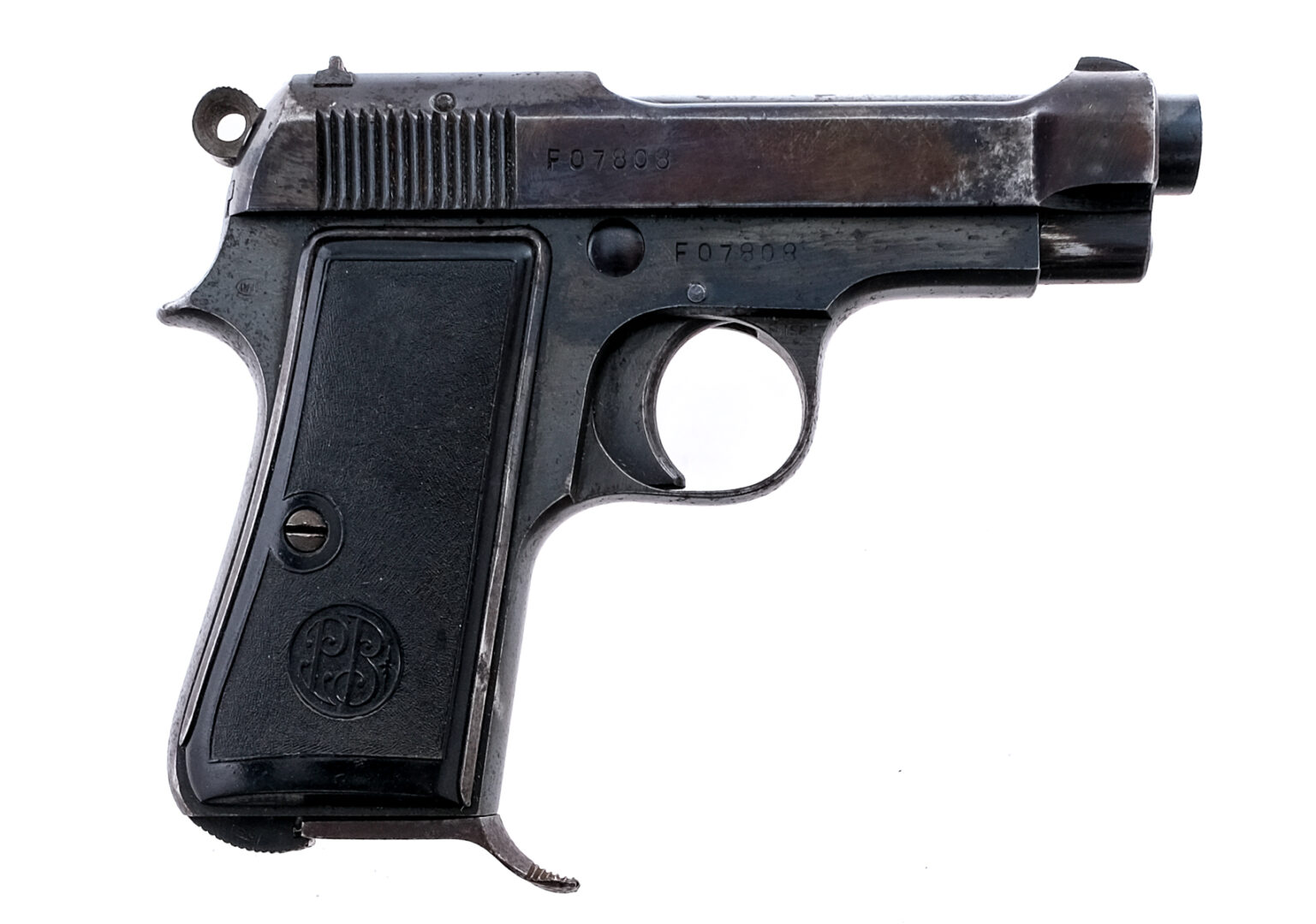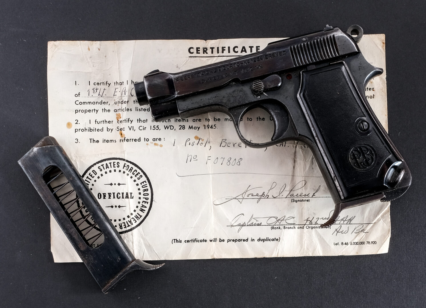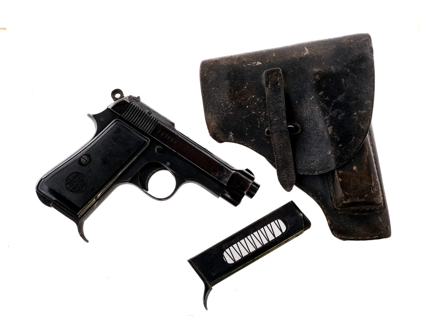 Description Beretta 1934 in 9mm Corto which is .380 with two, seven round removable magazines and a 3.5″ barrel. Black composite grip plates. Blued frame, solid trigger, serrated hammer, serrated slide and a barrel. Magwell located serrated magazine release and lanyard loop. Left side of frame serrated safety switch. Front and rear fixed sights. Rear left side of frame marked: RE for the Italian Army. Rear right side of frame marked: IVU which is a inspector mark for the 4th Technical Control Unit. Right side of trigger guard inspector marked: SE. Matching serial number on the slide and frame. This pistol was taken as a War Trophy during World War II. Comes with two magazines, period correct leather belt holster and the original WWII “Bring Back Paper”. Holster has a signature on the inside flap that is illegible. Must ship to a C&R or FFL holder. Condition: Good with light finish wear/loss and touches of rust. The magazines have light rust. Clean rifled bore. Barrel Length: 3.5″ Serial: F07808 Manufacturer: Beretta Year: 1942 Caliber: .380 ACP Model: 1934 Book# 00515