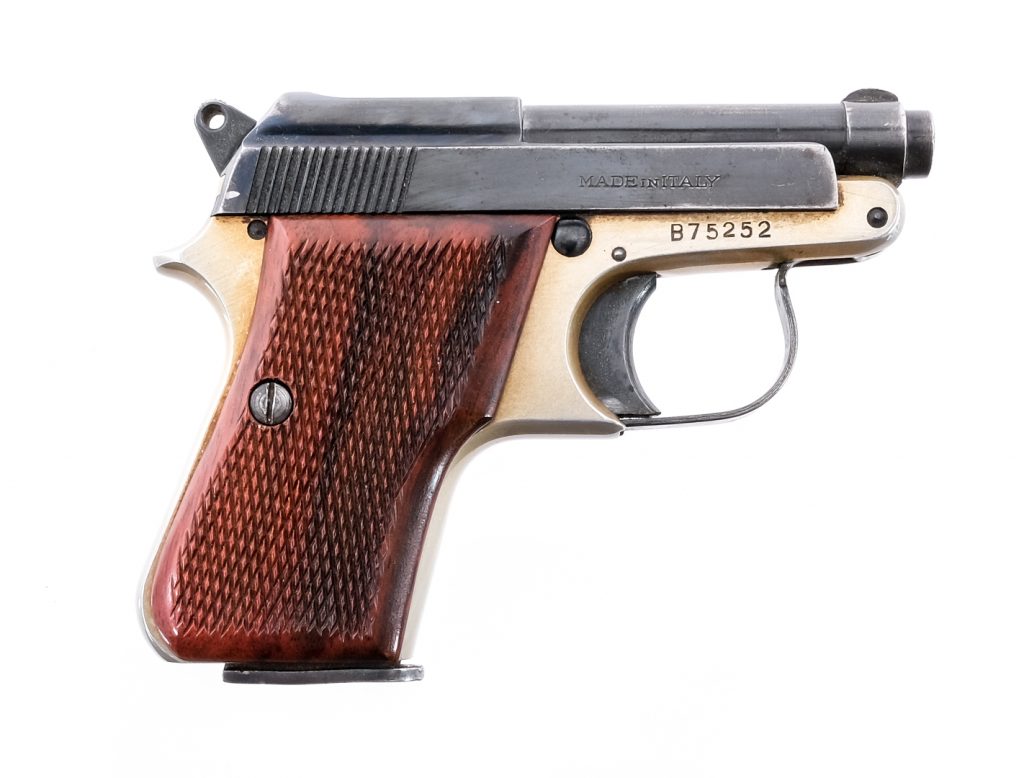 Description Beretta 950 Jetfire chambered in .25 ACP with one, eight round removable magazine and a 2.5″ barrel. Checkered wood grip plates. Anodized frame that has gained a yellow coloring with age. Blued tip up barrel, serrated slide, and hammer. Left side of frame serrated barrel tip up lever. Left lower side of grip located serrated magazine release button. Must ship to C&R or FFL holder. Condition: Good/Very good with scuffs, scratches and some finish loss throughout. Yellow coloring on frame from age. Small spots of metal oxidation. Clean bore with strong rifling. Barrel Length: 2.5″ Serial: B75252 Manufacturer: BERETTA Year: 1956 Caliber: .25 ACP Model: 950 Jetfire