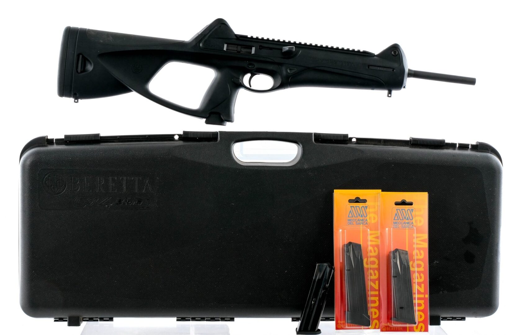 Description Beretta CX4 Storm in 9mm with three, seventeen round removable magazines and a 16.5″ barrel. Rubber butt pad. Composite pistol grip stock and front forend. Composite trigger and frame. Blued bolt and barrel. Pistol grip located push button safety. Left side of pistol grip magazine release. Right side of receiver charging handle. Top mounted optics rail. Left side of front forend located accessories rail. Rear flip up and front adjustable post sight. Metal eyelets for mounting a shoulder sling. Comes with its factory box including instruction manual, cleaning brush/rod, three extra magazines, two of the magazines still in boxes and factory trigger tags. Check Local/State Laws on Banned Weapons BEFORE bidding. Must ship to a FFL holder. Condition: Like New with light scuffs and handling wear. Barrel Length: 16.5″ Serial: CX19893 Manufacturer: Beretta Caliber: 9mm Model: CX4 Storm Book# 05254