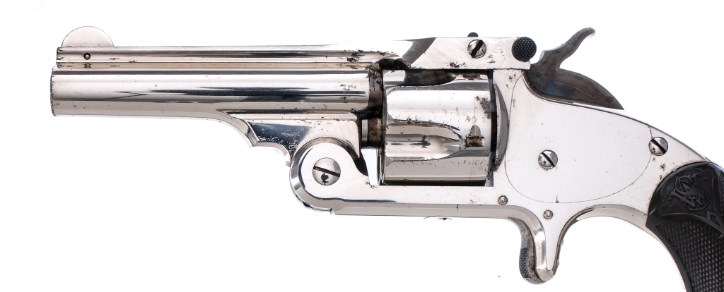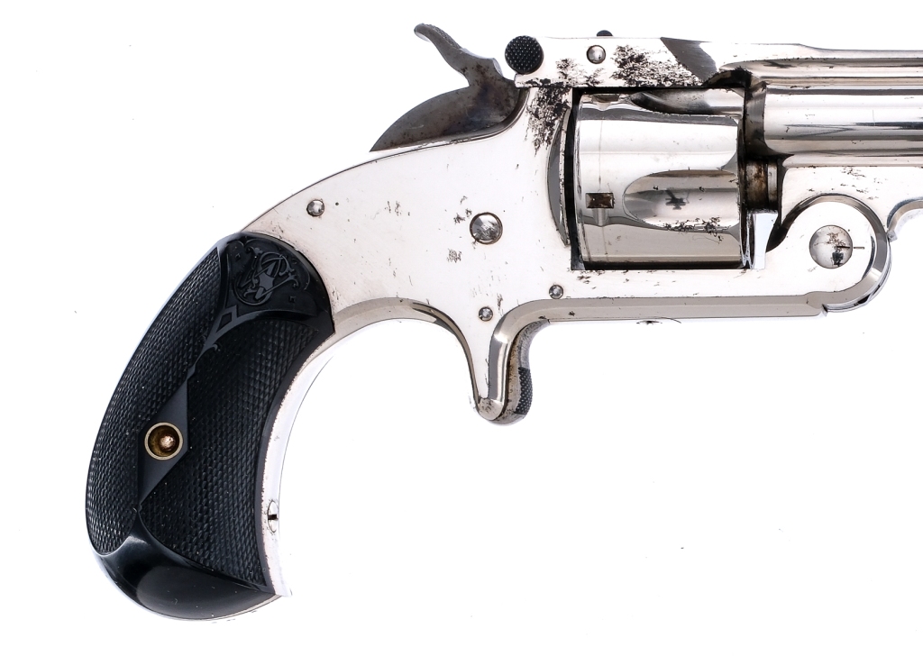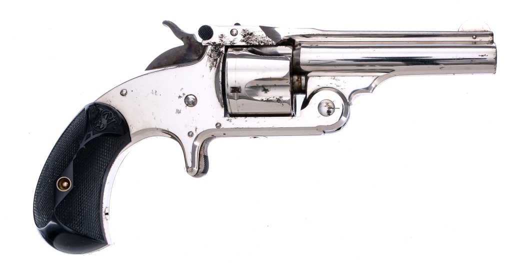 Description Smith Smith & Wesson Model One and a half in .32 S&W with a five round capacity and a 3″ barrel. Made in Springfield Massachusetts between 1878-1892. Checkered black composite grip plates. Nickel finished frame, cylinder and barrel. Case colored checkered trigger and hammer. Top of barrel checkered barrel tip up lever. Rear notch and front fixed blade sight. Right underside of grip plate marked with matching serial number to frame. Serial number on frame, barrel, cylinder and grip all are matching. Comes in factory box with written pencil matching serial number on underside, very faint. Antique, No FFL required and ships to MOST buyers home. Condition: Antique, Very Good with light scuffs, spots of rust and handling wear. The rifled bore has spots of rust and pitting. Barrel Length: 3″ Serial: 52042 Manufacturer: Smith & Wesson Caliber: .32 S&W Model: 1 1/2″ Year-Range 1878-1892
