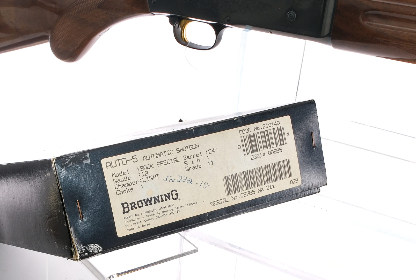 Description Browning Auto-5 Light Twelve in 12 gauge 2 3/4″ with a five round capacity and a 24″ barrel. Textured composite butt plate. Checkered wood stock and front forend. Blued trigger guard, stamp engraved receiver and barrel. Gold finished trigger. Rear trigger guard push button safety. Left side of receiver magazine cut-off. Right side of receiver charging handle and action release. Rear adjustable and front fixed blade sight. Comes in its factory box with trigger tag still attached. Must ship to a FFL holder. Condition: New with box and tags. Clean smooth bore. Barrel Length: 24″ Serial: 03765NX211 Manufacturer: Browning Gauge: 12 Year: 1993 Model: Auto 5 Light Twelve Book# 01429