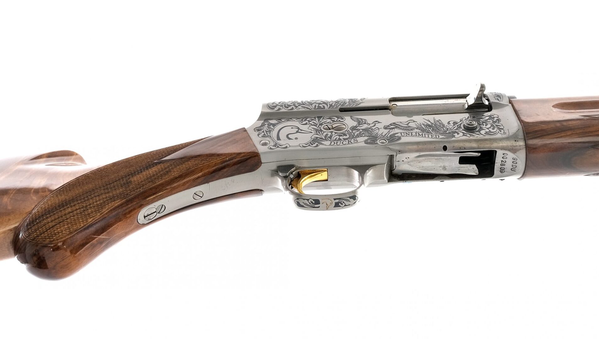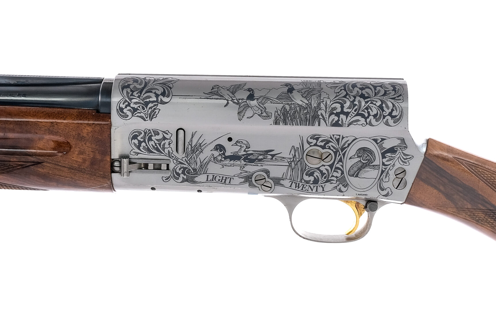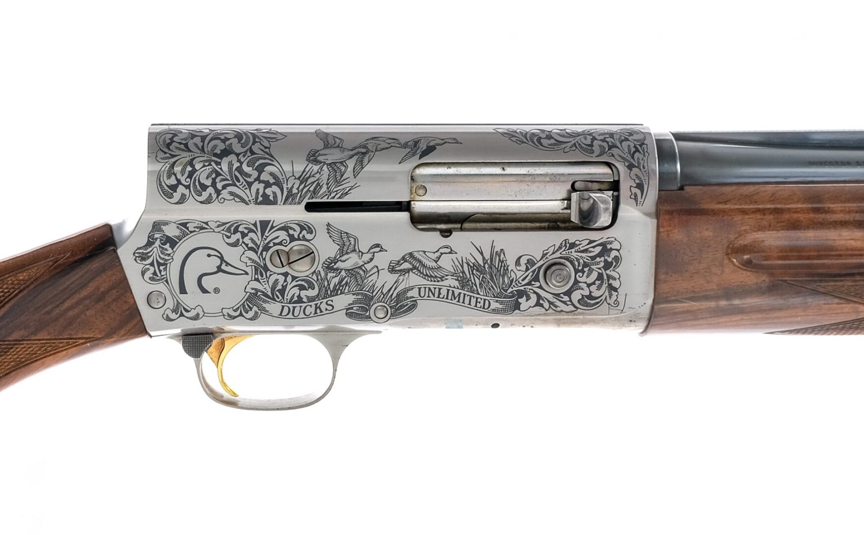 Description Browning A5 Light Twenty Ducks Unlimited in 20 gauge 2 3/4″ with a four round capacity and a 26″ Invector choke top rib vented barrel. Composite butt plate. Checkered premium wood stock and front forend. Stainless steel engraved receiver and trigger guard. Gold finished trigger. Blued barrel. Rear trigger guard push button safety. Right side of receiver charging handle and action release. Left side of receiver magazine cut-off lever. Front fixed metal bead sight. Front barrel sticker still attached warning of threaded internal barrel for interchangeable chokes. Left side of engraving marked: T. Nagano. Must ship to a FFL holder. Condition: Good with scratches, wood dings, finish wear/loss on the barrel and spots of rust. Clean smooth bore. Barrel Length: 26″ Serial: 90DU002809 Manufacturer: Browning Gauge: 20 Year: 1990 Model: A5 Light Twenty Ducks Unlimited Book# 01430