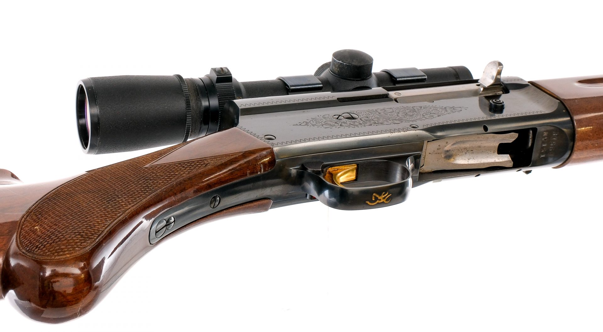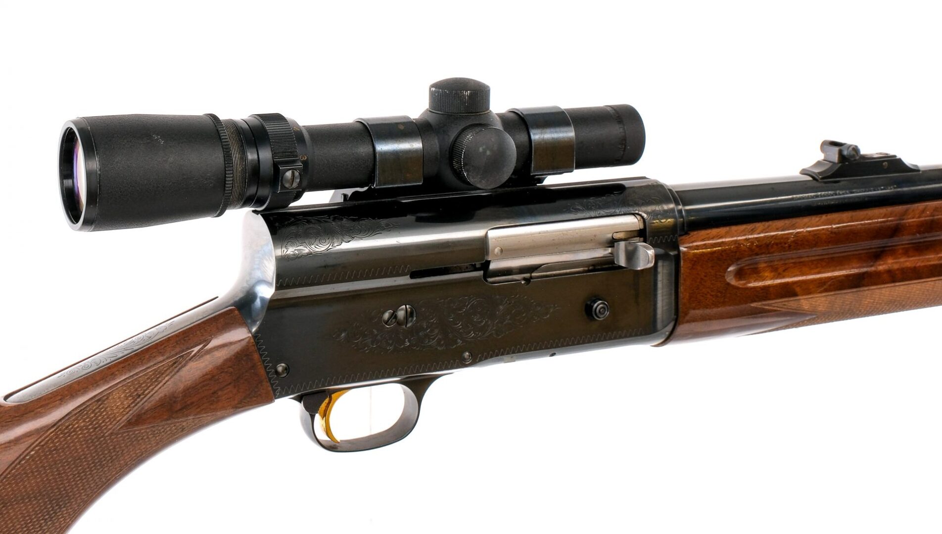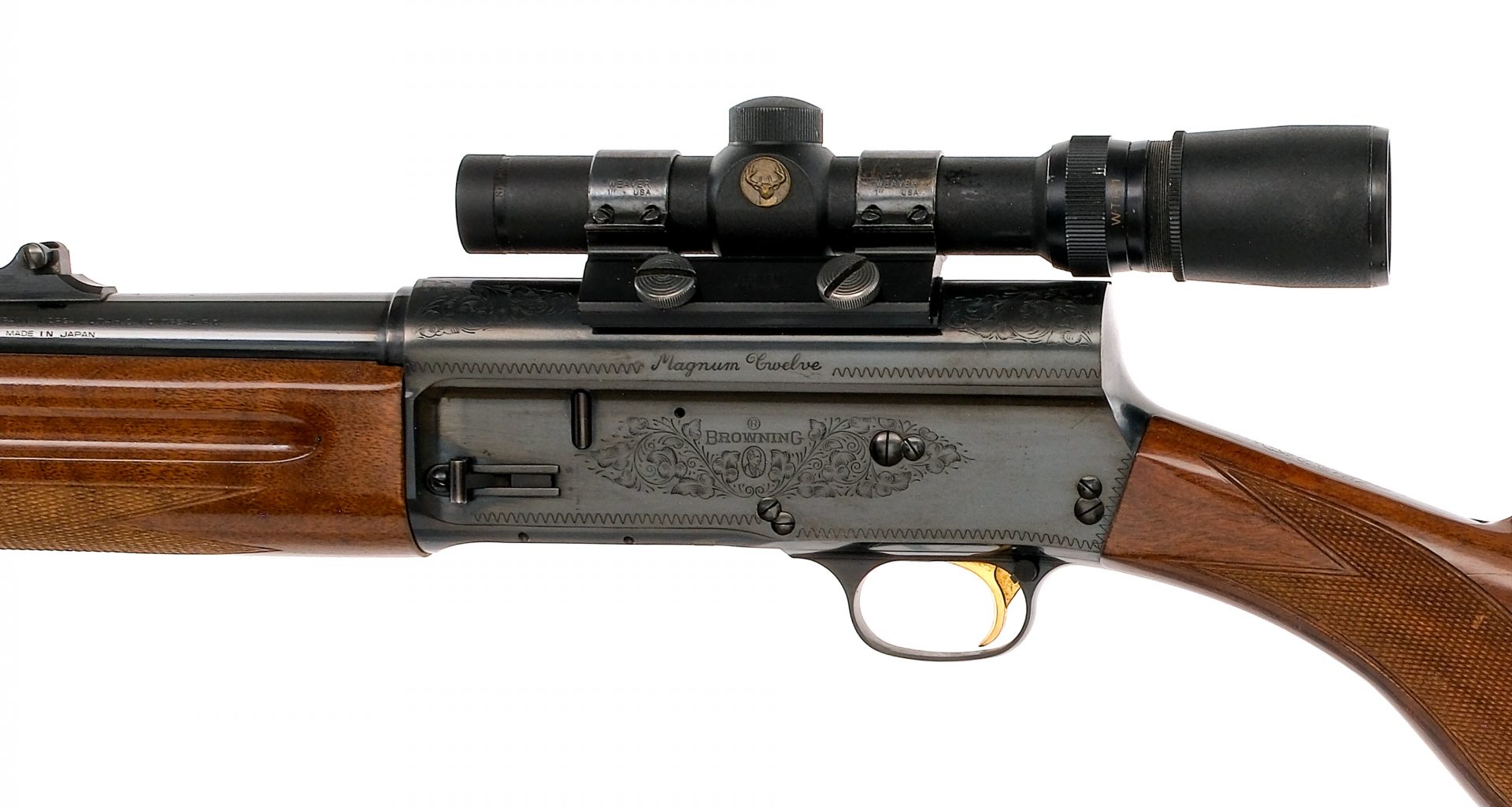 Description Browning Auto-5 Magnum Twelve in 12 gauge 3″ with a four round capacity and a 24″ MOD fixed choke barrel. Made in Japan. Rubber butt pad. Checkered round pistol grip butt stock and front forend. Blued trigger guard, receiver and barrel. Gold finished trigger. Rear trigger guard push button safety. Left side of receiver checkered magazine cut-off lever. Right side of receiver checkered charging handle and action release. Rear adjustable and front fixed blade sight. Top of receiver is mounted with a Simmons Whitetail Classic 1.5 5×20 scope with clear glass and a duplex reticle. Mounted with a Weaver Side-1″H scope mount. Must ship to a FFL holder. Condition: Very Good with scratches, dings and tiny touches of rust. Top of receiver is drilled and tapped with mounted optic rail. Clean smooth bore. Barrel Length: 24″ Serial: 3456NY151 Manufacturer: Browning Gauge: 12 Model: Magnum Twelve Book# 04946