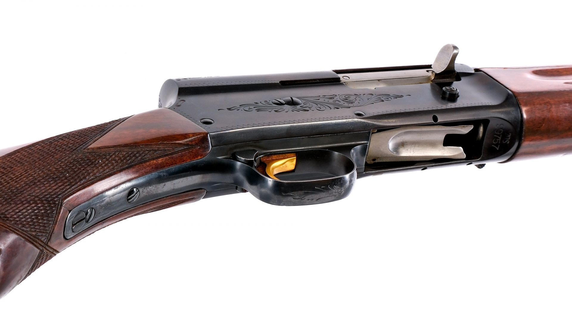 Description Browning Auto-5 Sweet Sixteen in 16 gauge 2 3/4″ with a four round capacity and a 23.5″ MOD fixed choke barrel. Made in Belgium. FN/Browning black composite butt plate. Checkered round pistol grip wood stock and front forend. Blued trigger guard, receiver and barrel. Gold finished trigger. Rear trigger guard push button safety. Left side of receiver magazine cut-off lever. Right side of receiver action release and checkered charging handle. Rear adjustable and front fixed blade sight. Must ship to a C&R or FFL holder. Condition: Good with light scuffs, cracks/repairs to the forend and a small crack on the right side of pistol grip and touches of very light rust. Clean smooth bore. Barrel Length: 23.5″ Serial: 70S99757 Manufacturer: Browning Gauge: 16 Year: 1970 Model: Sweet Sixteen Book# 05010