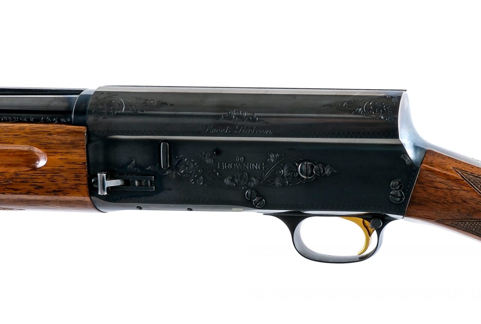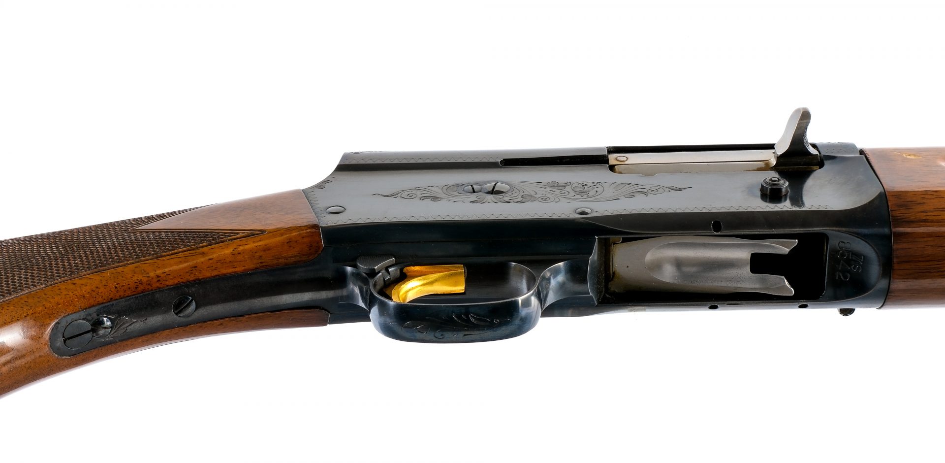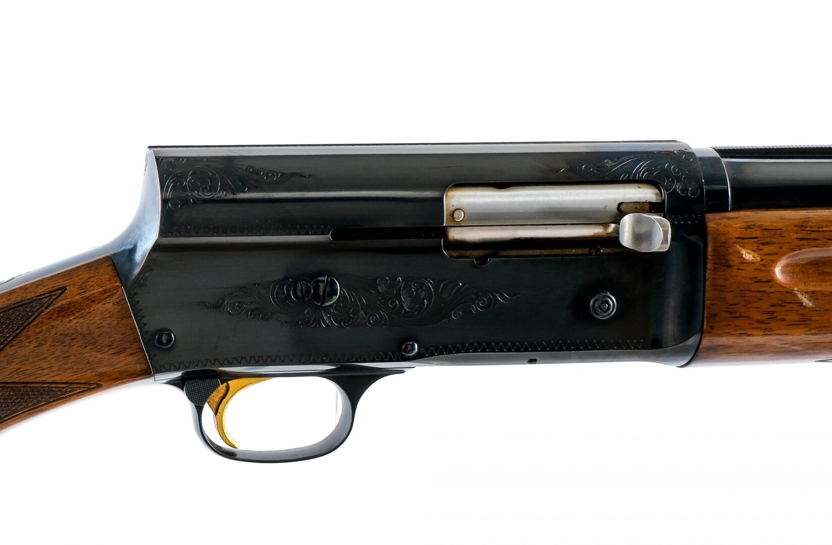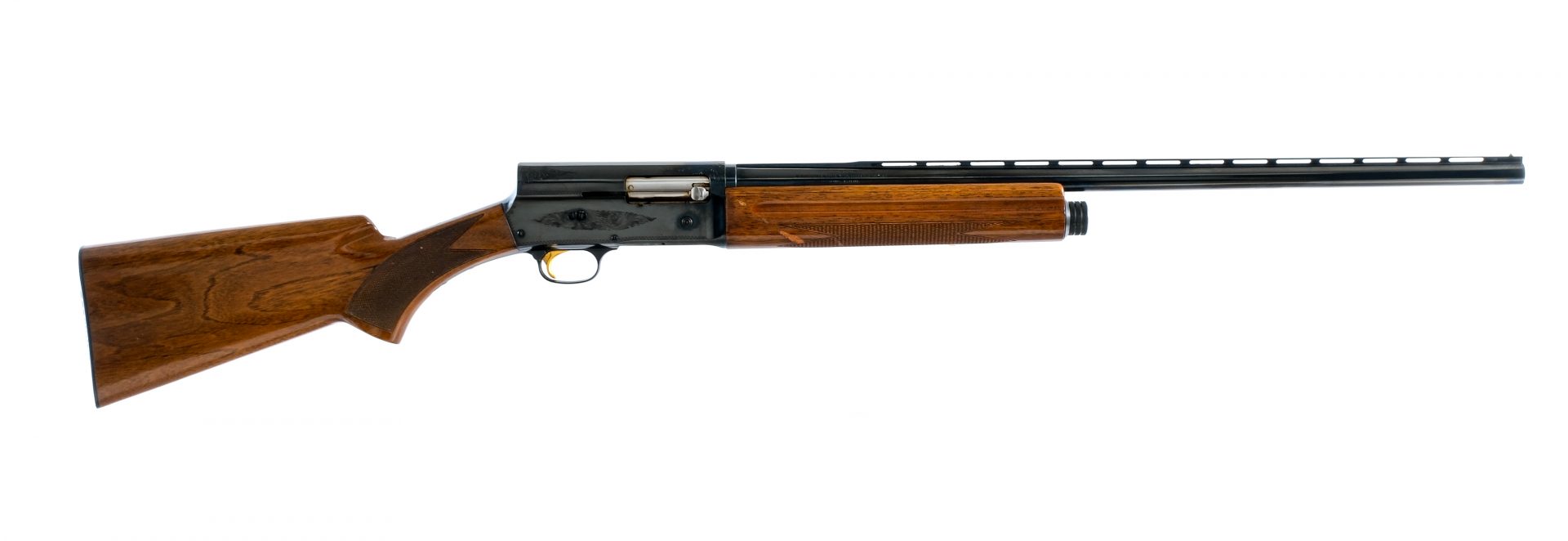 Description Browning Auto-5 Sweet Sixteen in 16 gauge 2 3/4″ with a four round capacity and a 25.5″ MOD fixed choke top rib vented barrel. Made in Belgium. FN/Browning black composite butt plate. Checkered flat pistol grip stock and front forend. Blued engraved trigger guard, receiver and barrel. Gold finished trigger. Left side of receiver magazine cut-off lever. Right side of receiver checkered charging handle and action release button. Front fixed metal bead sight. Comes with its factory box with written matching serial number and original receipt. Must ship to a C&R or FFL holder. Condition: Good/Very Good with light scuffs, wood dings and handling wear. Larger wood chip/damage on the right side of forend. Barrel Length: 25.5″ Serial: 71S8542 Manufacturer: Browning Gauge: 16 Year: 1971 Model: A5 Sweet Sixteen Book# 05002