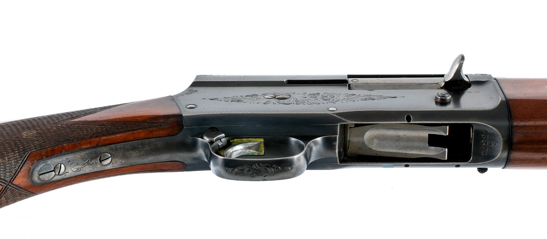 Description Browning Auto-5 Sweet Sixteen in 16 gauge with a four round capacity and a 27.5″ solid rib FULL fixed choke barrel. Made in Belgium. FN/Browning presses horn butt plate. Checkered round pistol grip wood stock and front forend. Blued trigger guard, receiver and barrel. Gold finished trigger. Rear trigger guard push button safety. Left side of receiver located magazine cut-off lever. Right side of receiver checkered charging handle and action release button. Front fixed metal bead sight. Must ship to a C&R or FFL holder. Condition: Good with scratches, wood dings, finish wear/loss and handling wear. Small metal ding on the forend cap. Clean smooth bore. Barrel Length: 27.5″ Serial: S43374 Manufacturer: Browning Gauge: 16 Year: 1955 Model: Sweet Sixteen Book# 04998