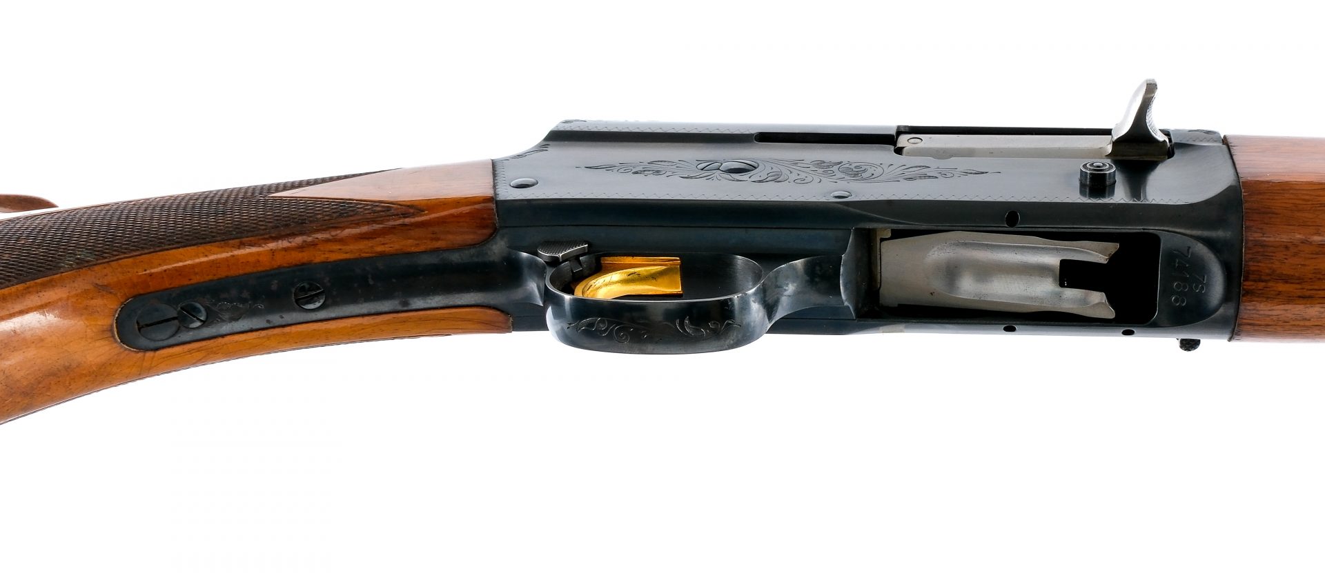 Description Browning Auto-5 Sweet Sixteen in 16 gauge 2 3/4″ with a four round capacity and a 25.5″ MOD fixed choke barrel. Made in Belgium. FN/Browning black composite butt plate. Checkered flat pistol grip stock and front forend. Blued engraved trigger guard, receiver and barrel. Left side of receiver checkered magazine cut-off lever. Right side of receiver checkered charging handle and action release button. Front fixed metal bead sight. Metal eyelets to mount a shoulder sling. Must ship to a C&R or FFL holder. Condition: Good with light scratches, handling wear, clear coat cracking and very small spots of rust. Clean smooth bore. Barrel Length: 25.5″ Serial: 7S74188 Manufacturer: Browning Gauge: 16 Year: 1967 Model: A5 Sweet Sixteen Book# 04938