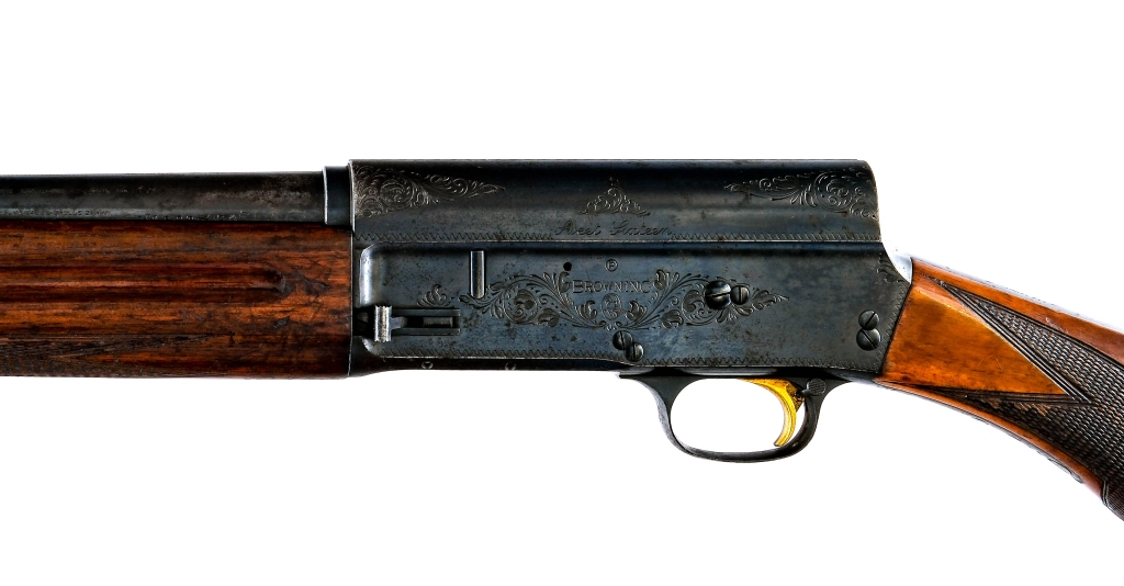 Description Browning Auto-5 Sweet Sixteen 16 gauge 2 3/4″ with a four round capacity and a 27.5″ FULL fixed choke barrel. Made in Belgium in 1955. FN/Browning black composite butt plate. Checkered round pistol grip stock and front forend. Blued engraved trigger guard, receiver and barrel. Gold finished trigger. Rear trigger guard push button safety. Left side of receiver magazine cut-off lever. Right side of receiver checkered charging handle and action release. Front fixed metal bead sight. Must ship to a C&R or FFL holder. Condition: Fair with scratches, wood dings, rust, finish wear and crack on the underside of forend wood. The smooth bore has very light rust spots. Barrel Length: 27.5″ Serial: S27347 Manufacturer: Browning Gauge: 16 Year: 1955 Model: A5 Sweet Sixteen Book# 07936