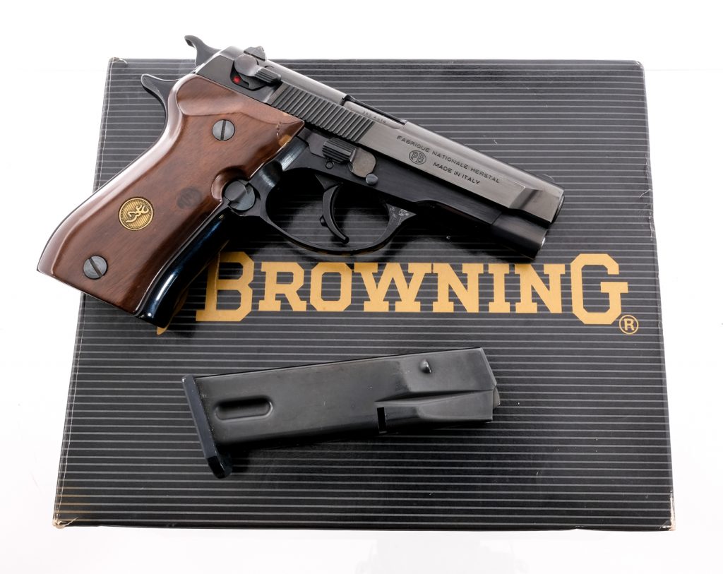 Description Browning model BDA in .9mm short (.380) with one thirteen round removable magazine and a 3 3/4″ barrel. Made in Italy. Solid wood smooth grip plates. Blued metal frame, barrel and slide. Ambidextrous safety switch on the rear of slide. Take-down switch on the right side of frame. Serrated trigger and fixed blade sights. Comes in factory box with matching serial number. Condition: Very Good/Excellent with light handling wear and some contact marks on the grips. Clean riffled bore. Barrel Length: 3 3/4″ Serial: NM02650 Manufacturer: BROWNING Year: 1990 Caliber: .380 Auto Model: BDA Book# 8-633