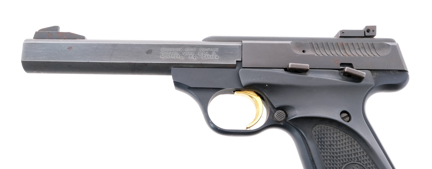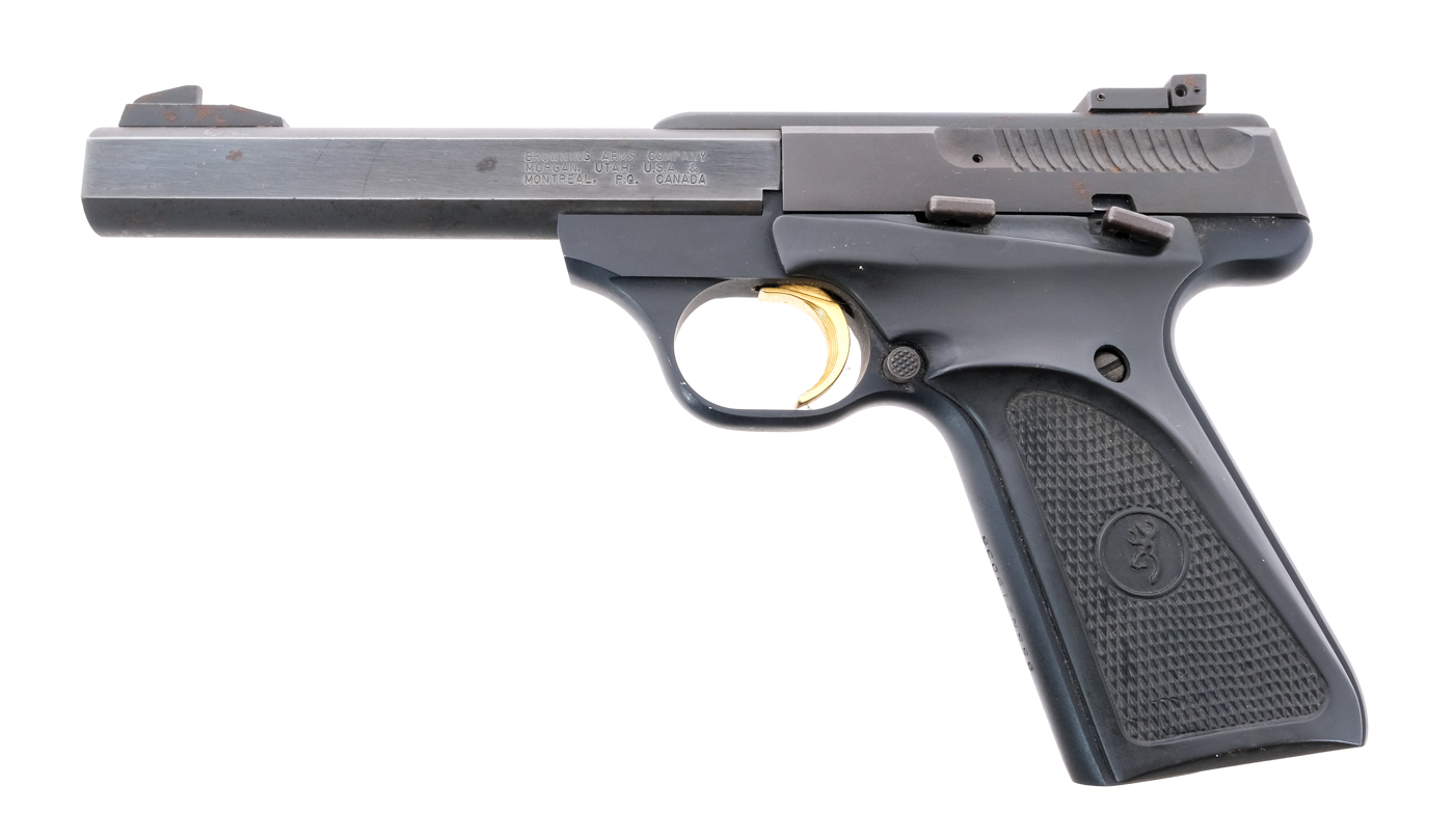 Description Browning Buck Mark in .22 Long Rifle with one, ten round removable magazine and a 5.5″ barrel. Checkered hard rubber grip plates. Blued frame, serrated slide and barrel. Serrated gold finished trigger. Left side of frame slide release and slide stop safety. Left side of frame checkered magazine release button. Rear adjustable and front fixed blade sight. Must ship to a FFL holder. Condition: Good with light rust and handling wear. Clean rifled bore. Barrel Length: 5.5″ Serial: 655NZ19036 Manufacturer: Browning Caliber: .22 LR Model: Buck Mark Book# 8-847