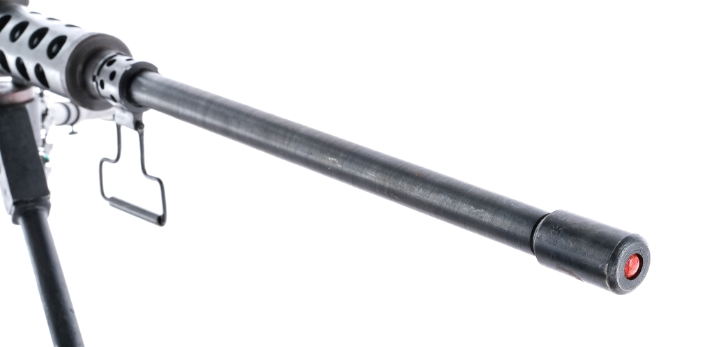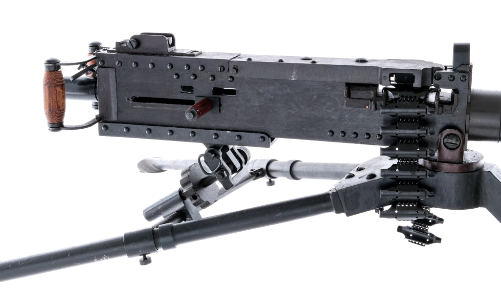 Description Scaled down semi functioning model of a Browning M2HB .50 caliber belt fed machine gun. Unknown manufacture and appears to be unsigned. Mounted on a tripod with pintle, also comes with model belt/links. Mostly steel construction with blued finish. Semi functional with the ability to rack the charging handle and open the top cover. The left side of the side plate is marked “Browning M2HB” over “12.7MM” over “HRJ00235″. The overall length of the gun its self is roughly 30 1/4″. The overall length of the model from barrel to the end of the bipod is roughly 36”. Non-Gun ships directly to buyers home. Condition: Very Good with light scratches, contact marks, and general cosmetic handling wear. Some spots of metal oxidation on the gun and tripod. Serial: HRJ00235 Manufacturer: Unknown Model: M2HB