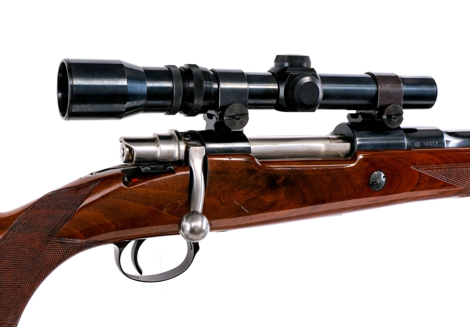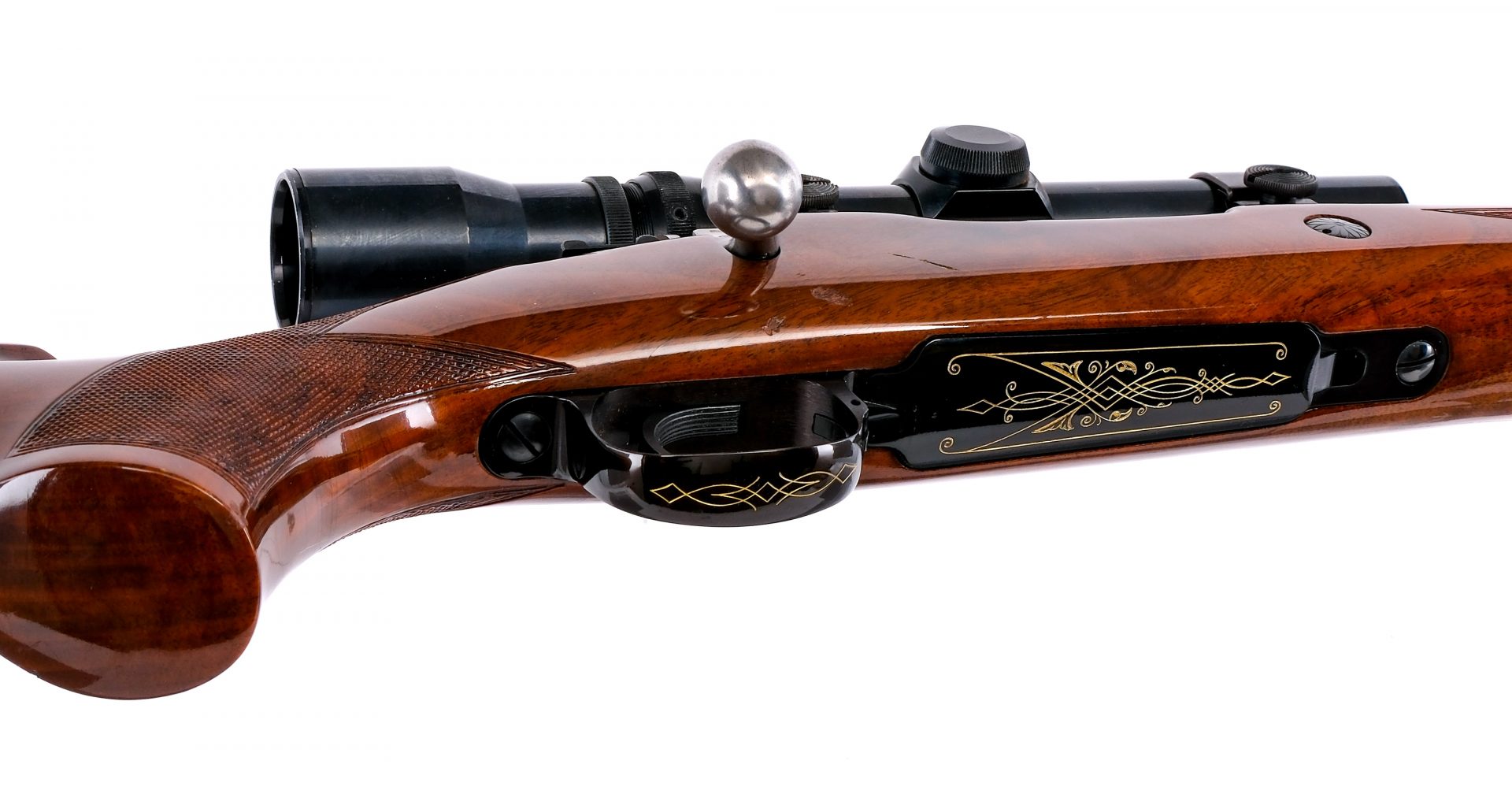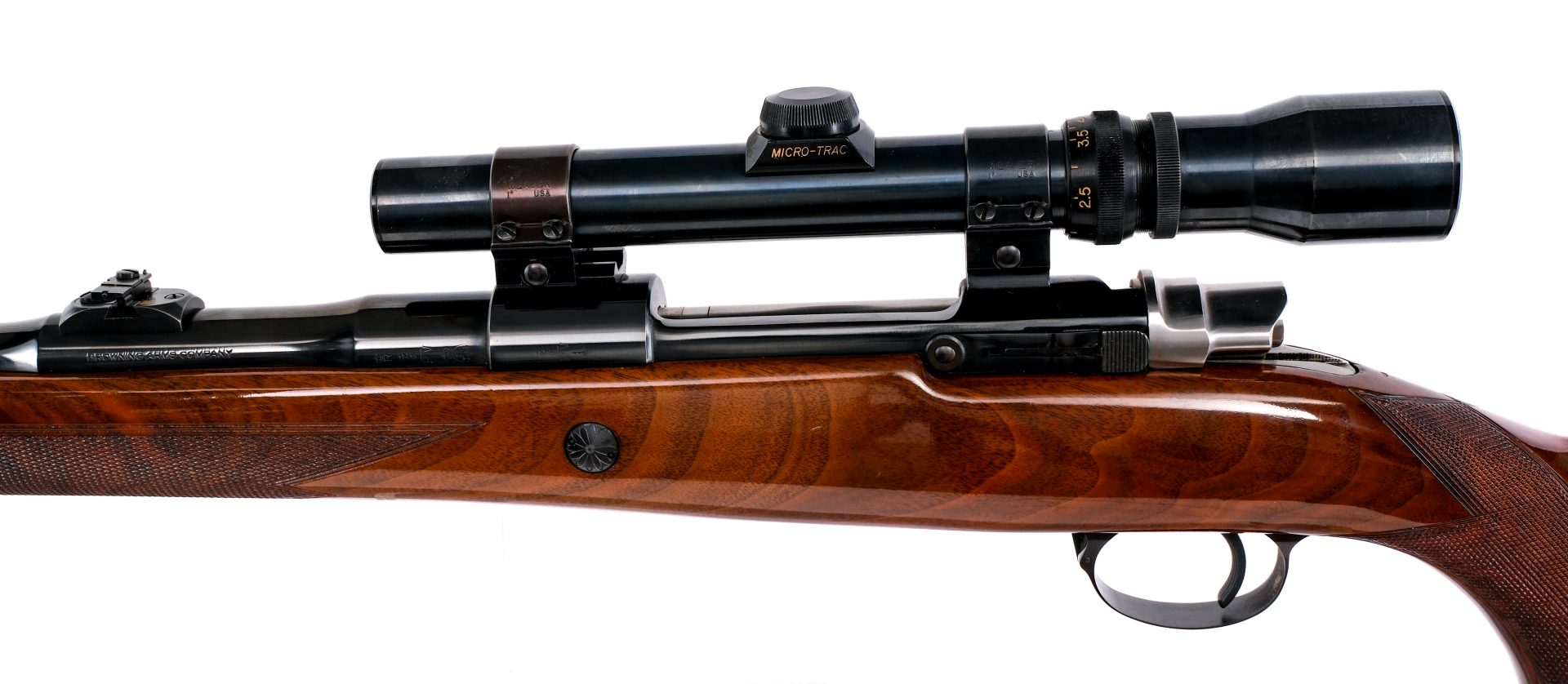 Description Browning Safari Grade in .30-06 with a four round capacity and a 22″ barrel. Black composite butt plate. Made in Belgium. Checkered walnut Monte Carlo style wood stock and front forend. Blued trigger guard, serrated trigger, receiver and barrel. Unfinished steel bolt. Gold scrollwork on the magazine floor plate. Rear right side of receiver safety switch. Left side of receiver bolt release. Rear flip up adjustable and front hooded fixed blade sight. Mounted with a Micro-Trac 4.5x scope with clear glass and a duplex reticle. Metal eyelets for mounting a shoulder sling. Must ship to a C&R or FFL holder. Condition: Good/Very Good with light scratches, wood dings and light clear coat cracking. Clean rifled bore. Barrel Length: 22″ Serial: 6L36317 Manufacturer: Browning Caliber: .30-06 Model: Safari Grade Year-Range 1966-1967 Book# 04987