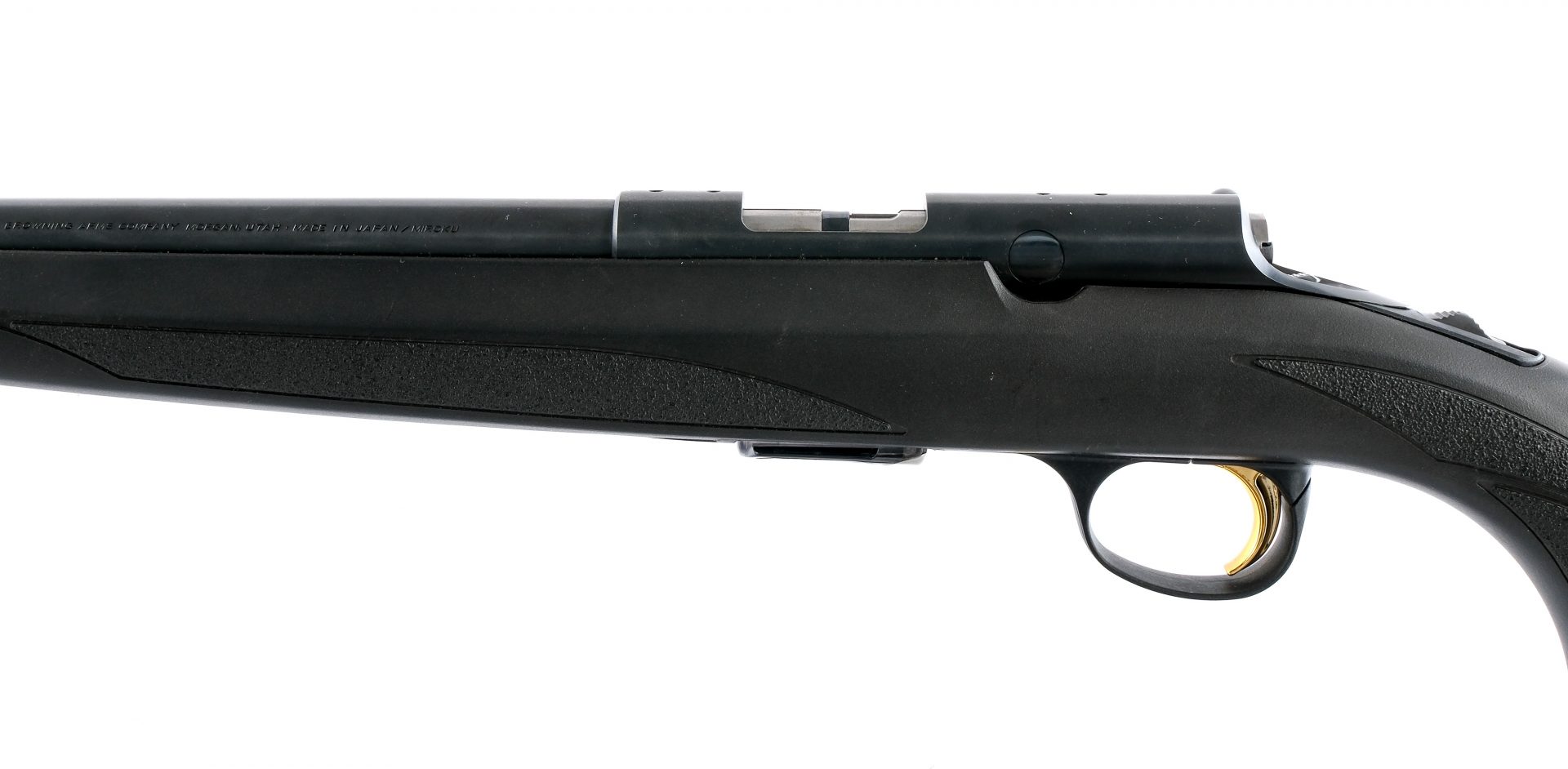 Description Browning T-Bolt in .17 Hornady Magnum Rimfire with two, ten round Double Helix removable magazines and a 22″ barrel. Composite butt plate with extra magazine compartment. Textured composite stock and front forend. Gold finished trigger. Blued bolt handle, receiver and barrel. Magwell located magazine release. Rear receiver tang slide button safety. No fixed sights. Top of receiver is drilled and tapped for optics. Metal eyelets for mounting a shoulder sling. Must ship to a FFL holder. Condition: Excellent with light handling wear. Clean rifled bore. Barrel Length: 22″ Serial: 01863ZY253 Manufacturer: Browning Caliber: .17 HMR Model: T-Bolt Book# 05259