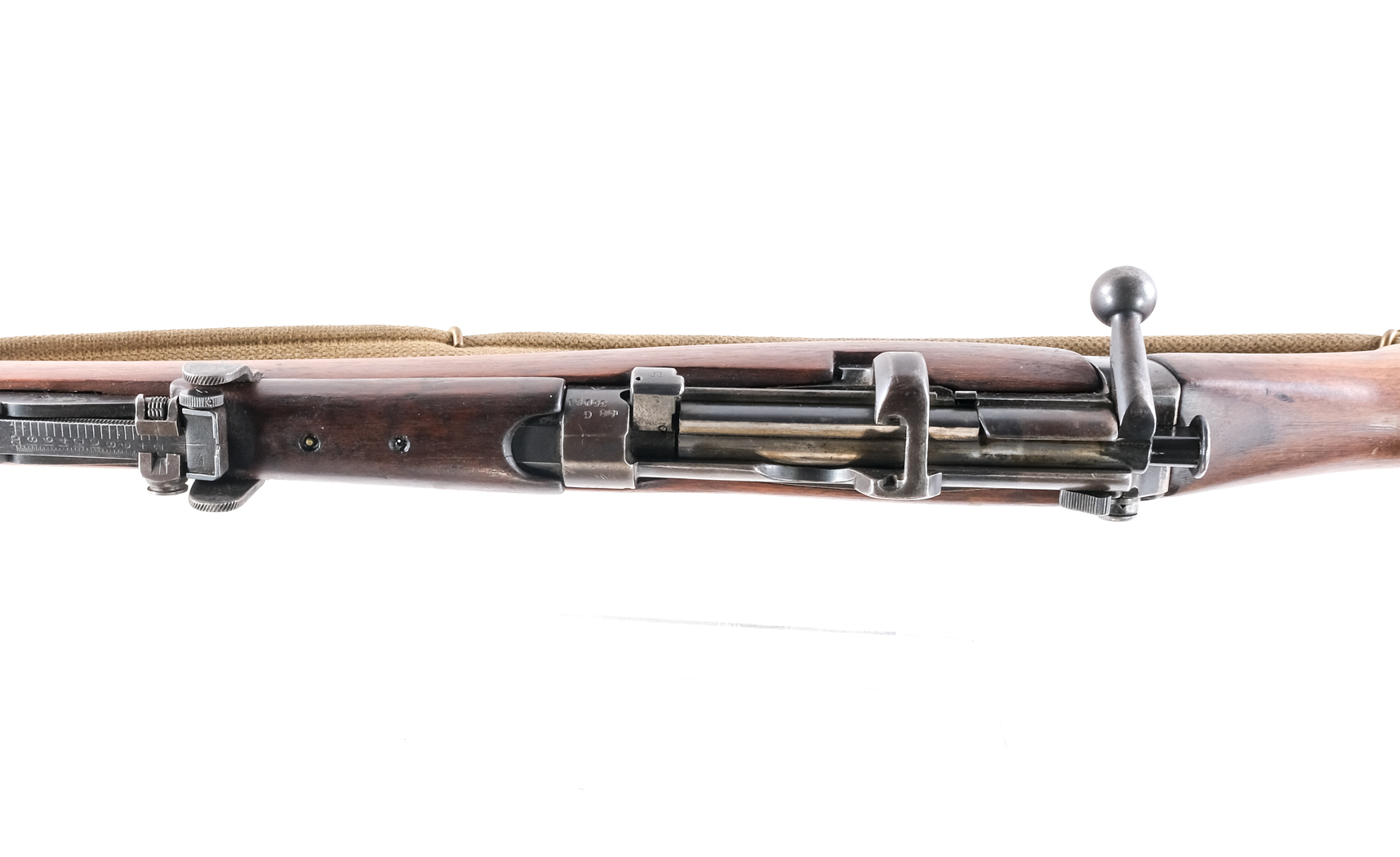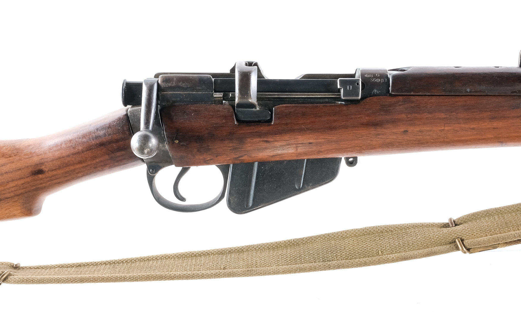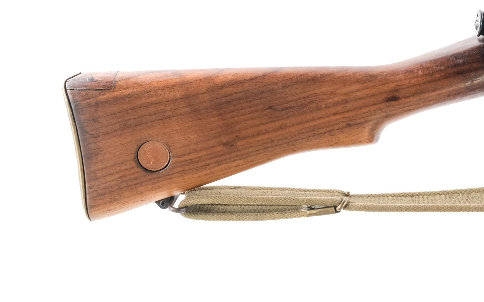Description British Small Arms Enfield SHTLE III in .303 British with one, ten round removable magazine and a 25″ barrel. Brass metal butt plate with cleaning kit door, empty. Smooth wood stock and front forend. Blued trigger guard, serrated trigger, magazine, receiver, bolt and barrel. Inside the trigger guard magazine release. Left side of receiver safety switch. Under barrel fixed bayonet lug. Rear flip up adjustable and front fixed blade sight. Comes with a cloth and brass shoulder sling. British coin inlaid into butt stock. Must ship to a C&R or FFL holder. Condition: Good with the wood refinished, wood fill repair on the butt, scratches and handling wear. The rifled bore has a touch of rust in the rifled grooves. Barrel Length: 25″ Serial: 35961 Manufacturer: BSA Year: 1917 Caliber: .303 Model: SHTLE III Book# 9-666
