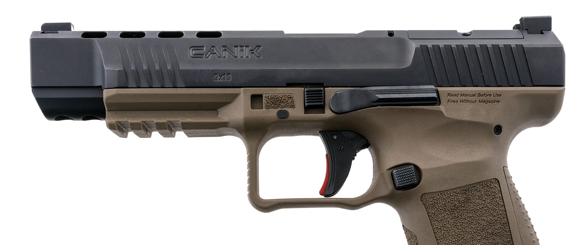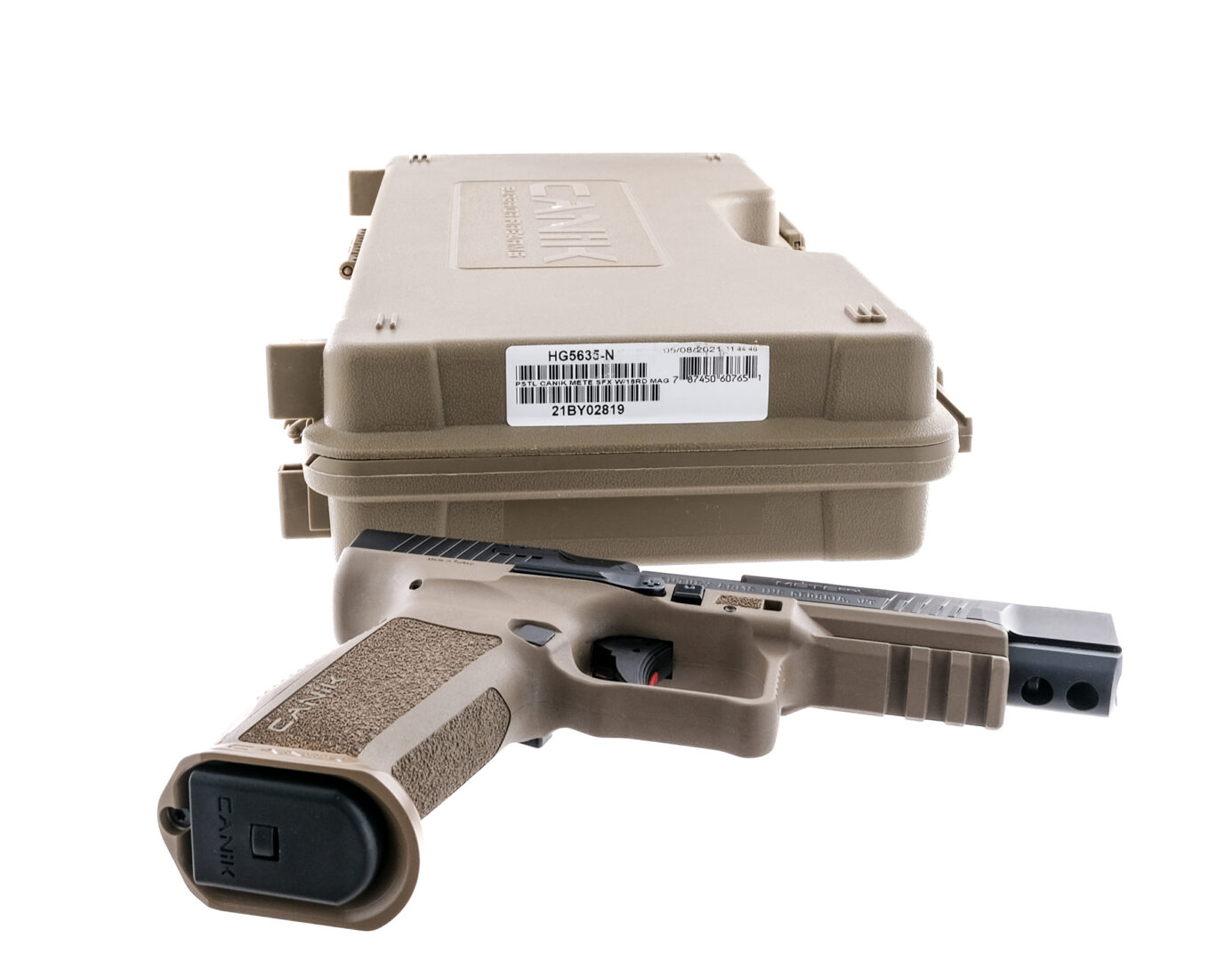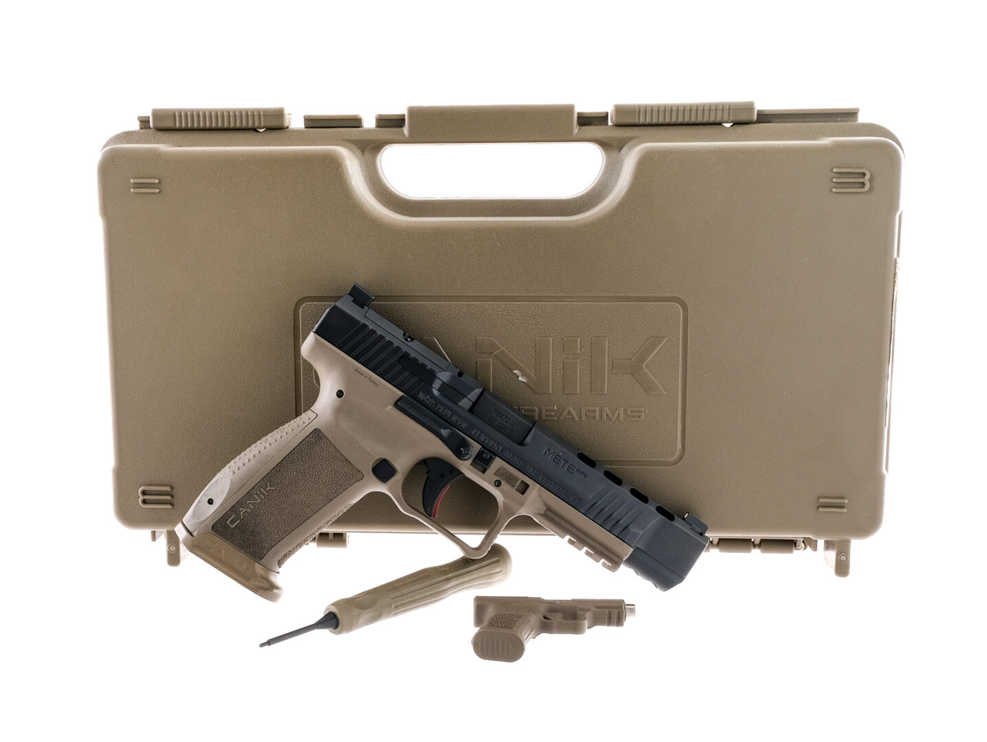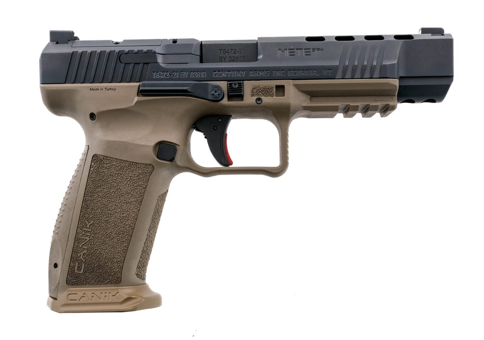 Description Canik METE SFx semi auto pistol chambered in 9mm with a 5.2″ barrel. and a ten round removable magazine. This Canik is a single action striker fired handgun with a ported steel slide, with co-witness optics cut, and three dot iron sights. Frame is polymer with aggressive stippling, ambidextrous slide stop release, removable mag flare, reversible steel magazine release, and front Picatinny rail. Features loaded chamber indicator and striker indicator. Comes with matching case, cleaning kit, magazine block, optic plate covers, and extra backstrap. Must ship to a FFL holder. Condition: Excellent, with no noticeable signs of use. Clean rifled bore. Barrel Length: 5.2″ Serial: 21BY02819 Manufacturer: Canik Caliber: 9mm Model: mete sfx Book# 01098