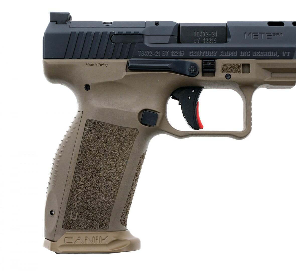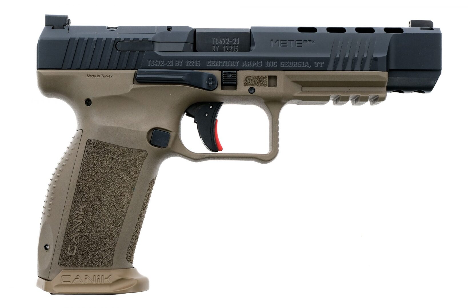 Description Canik METE SFx semi-automatic pistol chambered in 9mm with a 5.2″ barrel and two, ten round removable magazines. Made in Turkey and Imported by Century Arms. White three dot adjustable iron sights with co-witness optics cut. Ported front and rear serrated black slide. FDE polymer frame with under barrel picatinny accessory rail and grip stippling. Ambidextrous extended serrated slide stop. Checkered left side mag release. Flared magwell. Comes in its original factory box with holster, extra backstrap, mounting plates, cleaning supplies, two magazines, and miniature Canik bit holder. Condition: Like new-in-box with very minimal shooting and handling wear. Rifled bore is extremely bright and clean. Barrel Length: 5.2″ Serial: 21BY12215 Manufacturer: CANIK (55) Caliber: 9x19mm Parabellum Model: Mete SFx Book# 05622