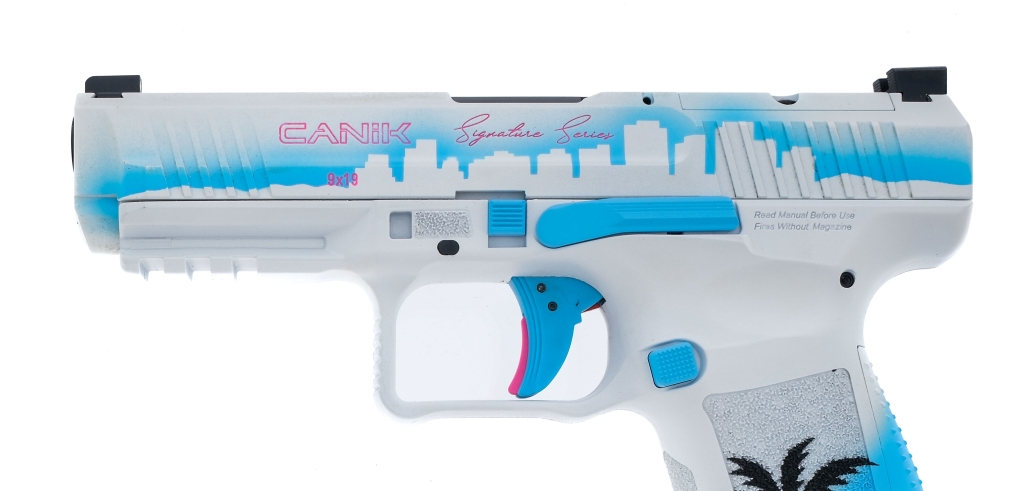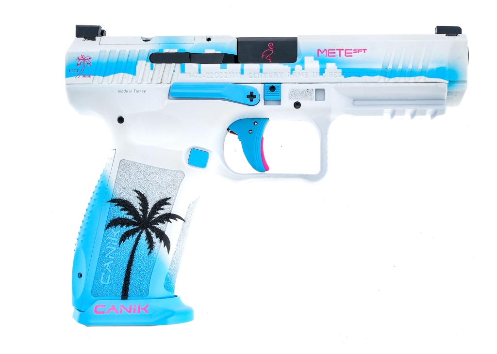 Description Canik Signature Series METE SFT Miami Days semi auto pistol chambered in 9mm with two magazines and a 4.46″ barrel. One magazine is 18 round and the other is 20 rounds. Number 1111 of 3050 made. Full Miami days Signature series finish and engraving. Show palm tree and Miami skyline scenes. Textured polymer frame with under barrel accessories rail. Removable flared magazine well. Striker fired trigger with trigger shoe safety. Steel slide with front and rear cocking serrations and rear cocked striker indicator. Three white dot iron sights. Optics read slide compatible with Trijicon RMRcc and Shield RMS/RMSc footprints. Comes in its factory box with factory paperwork, IWB/OWB holster, magazine loader, tool kit, punch, optics plates, backstrap, cleaning rod/brush, patch, and two magazines. Must ship to a FFL holder. Check local laws regarding “High Capacity” magazines BEFORE bidding. Condition: Factory new in box. Barrel Length: 4.46″ Serial: 22CC21111 Manufacturer: CANIK Caliber: 9x19mm Parabellum Model: Mete SFT Miami Days Book# 10-610