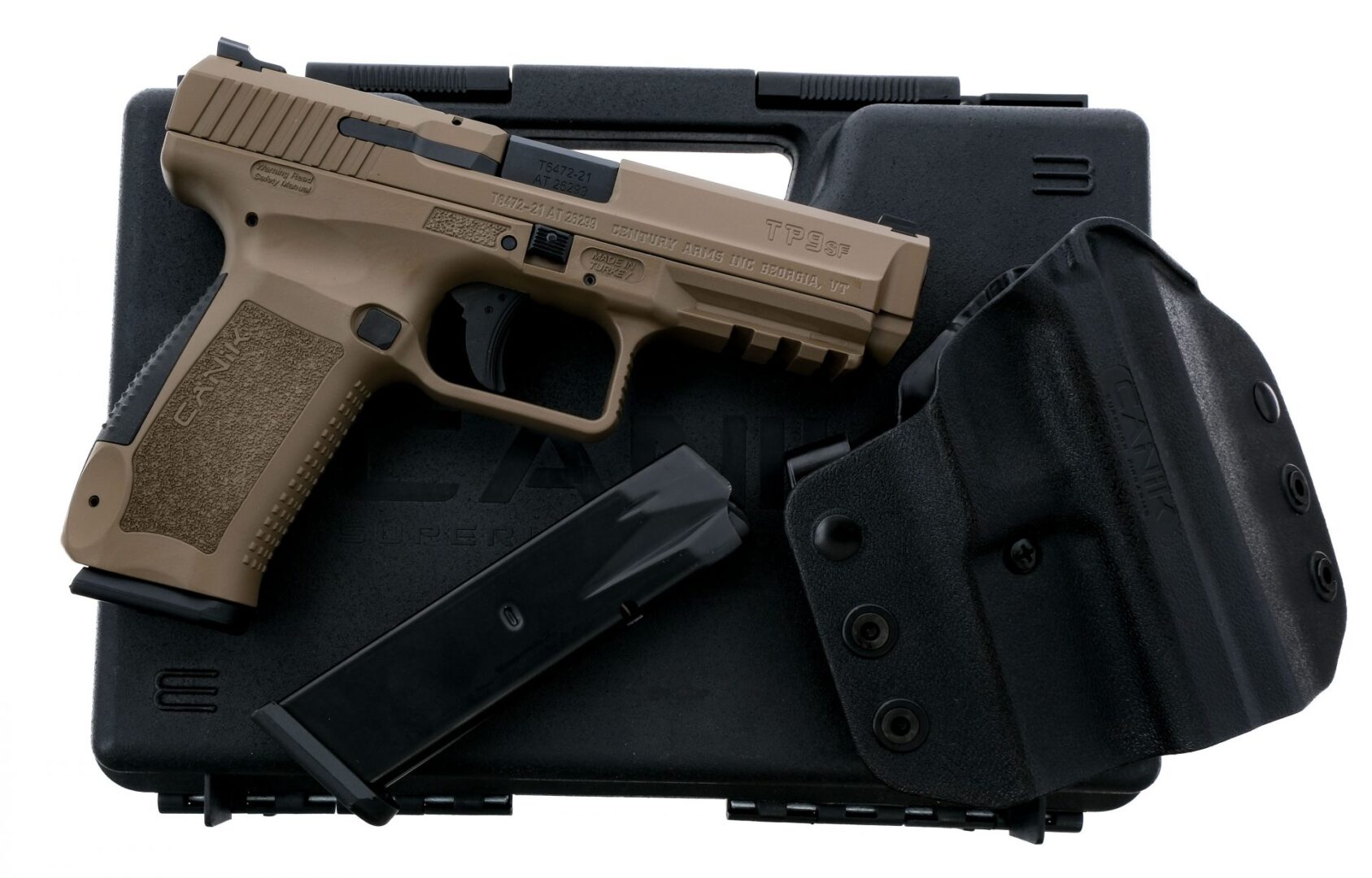 Description Canik TP9SF chambered in 9mm with two, ten round removable magazines and a 4.46″ barrel. Desert tan polymer frame with textured grip, interchangeable backstrap, and under barrel accessories rail. Textured magazine release and slide stop. Desert tan steels serrated slide with white three-dot iron sights. Comes in its factory box with manual, holster, cleaning rod/brush, backstrap, and two magazines. Must ship to a FFL holder. Condition: Very Good/Excellent with very light wear from normal handling/operation. Clean rifled bore. Barrel Length: 4.46″ Serial: T6472-21AT26299 Manufacturer: CANIK (55) Caliber: 9x19mm Parabellum Model: TP9SF Book# 05617