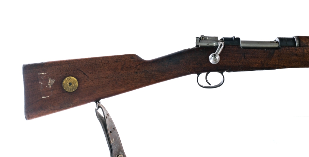 Description Carl Gustaf Stads Model 1896 chambered in 6.5x55mm with a five round capacity and a 29″ barrel. Manufactured in 1902 and imported by Century Arms, marked on the front barrel. Finish worn metal butt plate. Smooth front forend and wood stock with disk. Blued trigger guard, trigger, receiver and barrel. Unfinished steel bolt. Rear bolt safety switch. Rear left side of receiver bolt release. Under barrel fixed bayonet lug and removable cleaning rod. Rear flip up adjustable and front fixed blade sight. All external serialized parts appear to be matching. Crown proofs on many of the metal parts. Mounted with a leather shoulder sling. Must ship to a C&R or FFL holder. Condition: Good with scratches, wood dings, finish wear and spots of rust. The rifled bore has light rust with strong visible rifling. Barrel Length: 29″ Serial: KB123517 Manufacturer: Carl Gustafs Stads Year: 1902 Caliber: 6.5x55mm Model: M96 Book# 08424