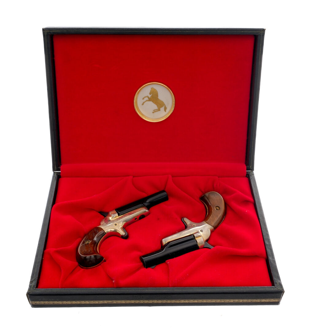 Description Cased set of 2 “Lord Deringer” single shot derringers chambered in .22 Short and a 2.5″ barrel. Black finished barrel with “-COLT-” marked on the top. Made by Colt in Hartford, CT. Checkered hammers and smooth triggers. Sequential serial numbers. Brass colored framed and wooden grip plates. Must ship to C&R or FFL holder. Condition: Good with light speckling of finish wear on the barrels. The brass finish on the frames is wearing. Rifles bores are both bright and clean. Barrel Length: 2 1/2″ Serial: 2133DER, 2134DER Manufacturer: COLT Caliber: .22 Short Model: Lord Deringer Year-Range 1959-1960s Book# 02684, 02686