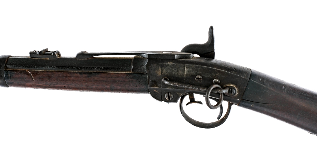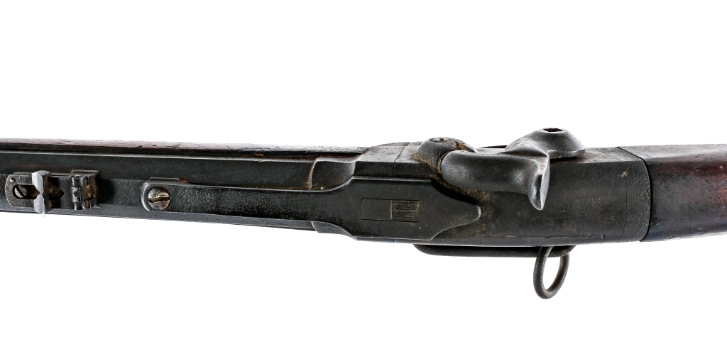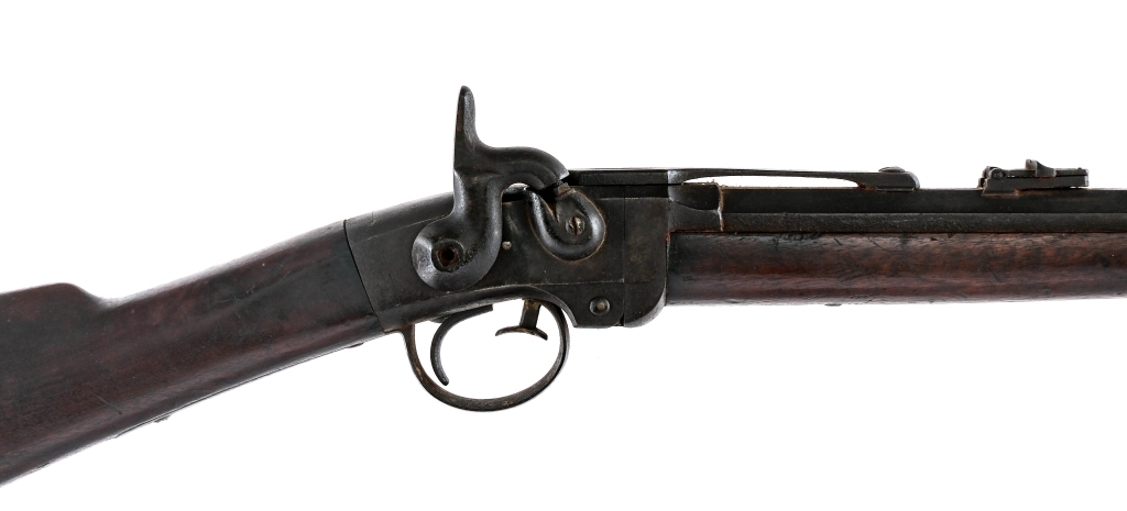 Description American Machine Works Smith Carbine chambered in .50 Smith with a single shot breech loading capacity and a 21.6″ barrel. Four digit serial number of 8662. Patinated blued barrel, trigger, and hammer. Case colored frame with Saddle ring and saddle bar. Smooth wood forend and straight stock with metal butt plate. Adjustable rear sight and MISSING the front blade sight. The left side of the frame is marked “SMITH’S PATENT JUNE 23, 1857”, “ADDRESS POULTNEY & TRIMBLE BALTIMORE U.S.A.”. The manufacture stamp is faded and difficult to read but states “MANUFACTURED BY AM N M SH N WKS SPRINGFIELD”. Cartouche on the left side of the stocks grip. Antique ships directly to buyers home in MOST states. Condition: Poor with heavy finish patina, metal oxidation, and pitting. The action is stiff and difficult to open with metal oxidation throughout the inside. The trigger does not work, the hammer is also missing a piece. The hammer is able to be cocked back but does not drop without being guided. Scratches ,scuffs, and dings on the wood. Some cracks in the stock. There is a hole drilled through the stock. The bore is dark with heavy spots of rust throughout. SOLD AS-IS. Barrel Length: 21.6″ Serial: 8662 Manufacturer: American Machine Works Caliber: .50 Smith Model: Smith Carbine