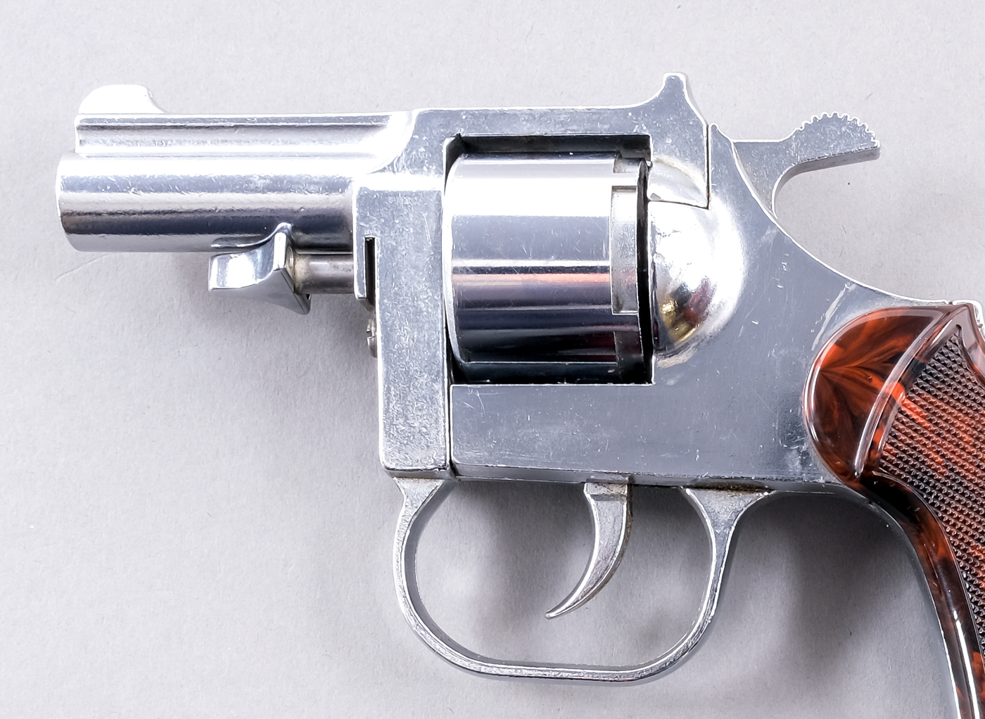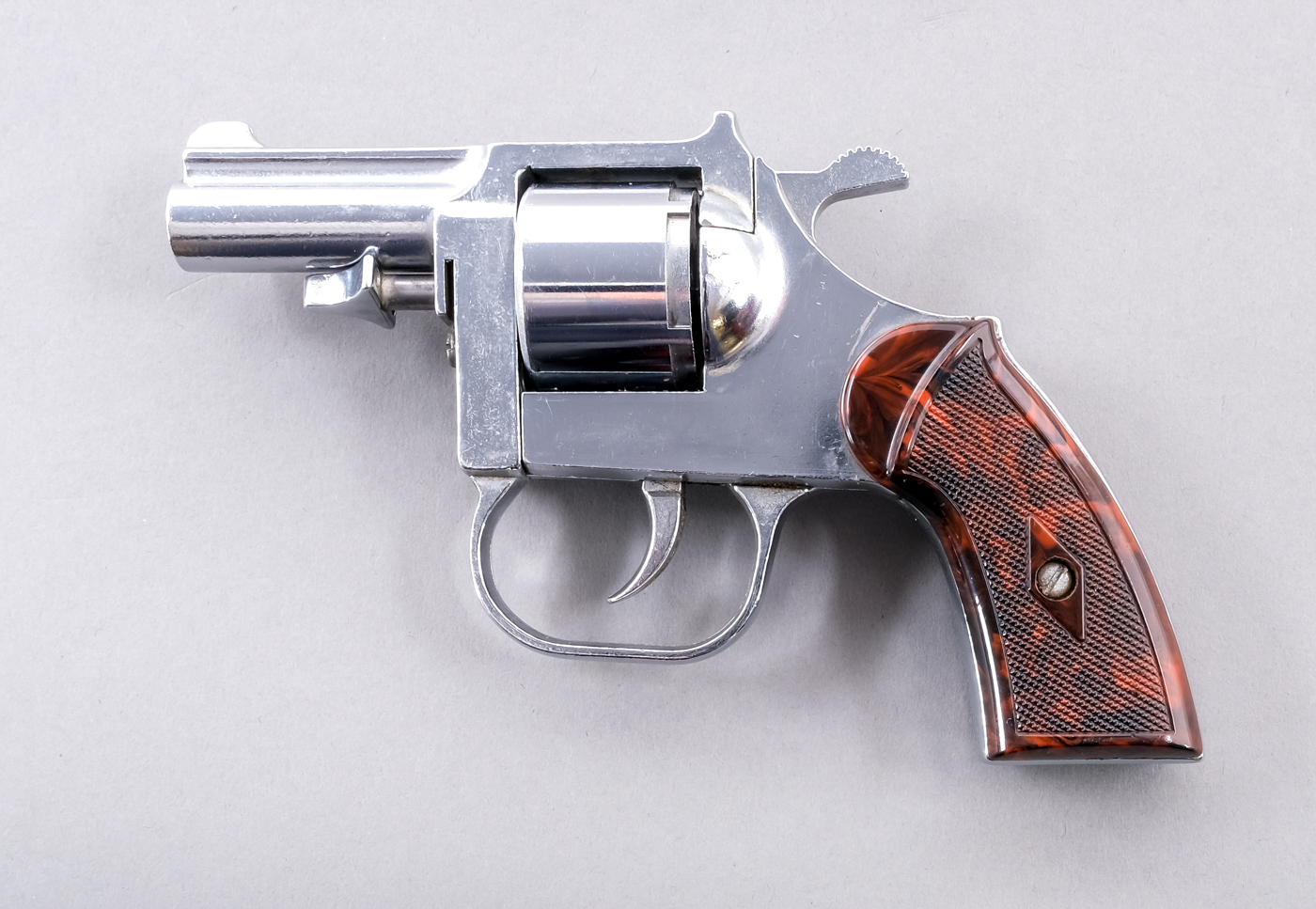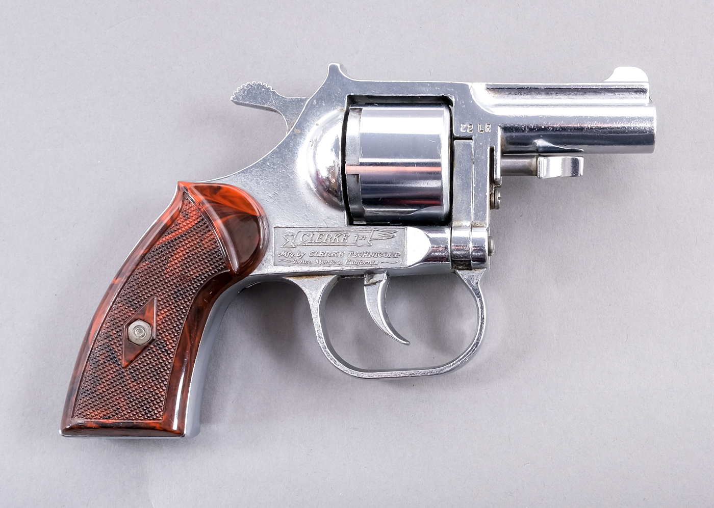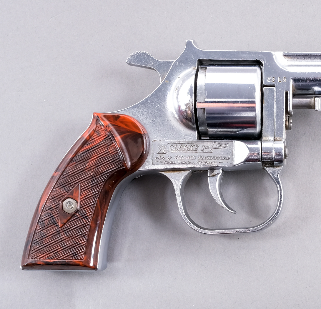 Description Clerke 1st in .22 Long Rifle with a five round capacity and a 2.25″ barrel. Checkered composite grip plates. Chrome plated frame, untextured trigger, guard, cylinder, serrated hammer and barrel. Under barrel cylinder release pin. Front and rear fixed sights. Must ship to a C&R or FFL holder. Condition: Very good/Excellent with light scuffs and handling wear. Clean rifled bore. Barrel Length: 2.25″ Serial: 296035 Manufacturer: Clerke Technicorp Caliber: .22 LR Model: 1st Book# 9-207