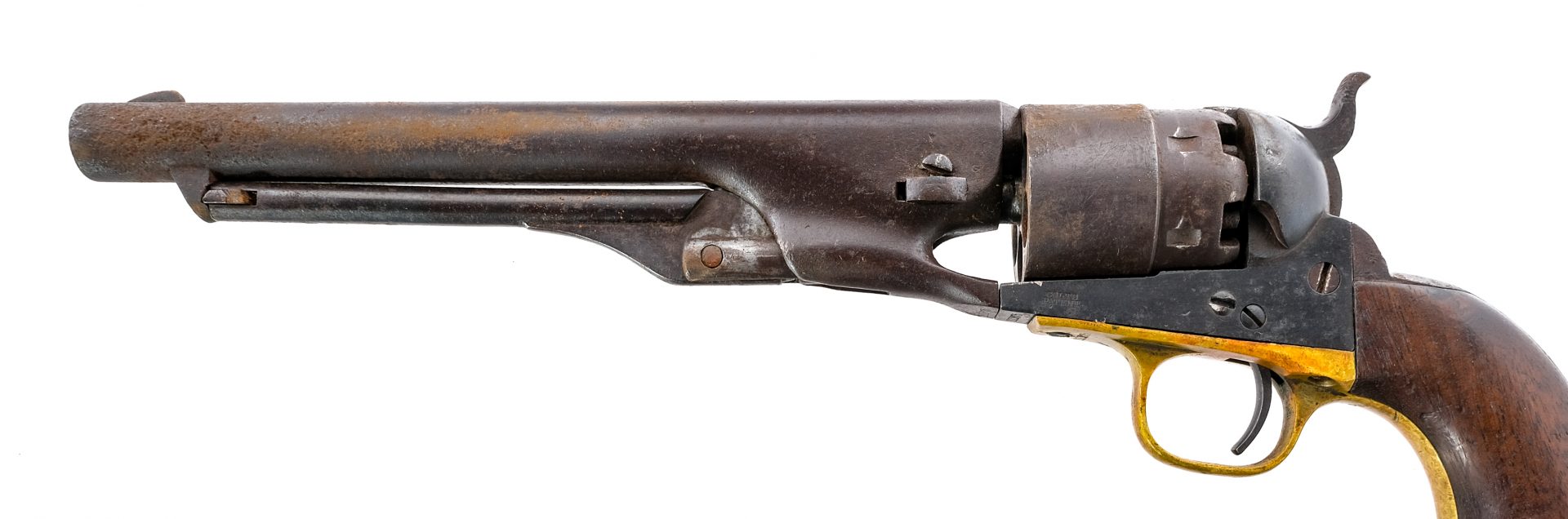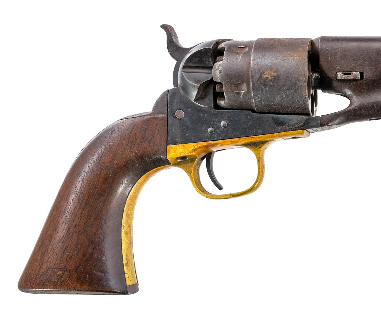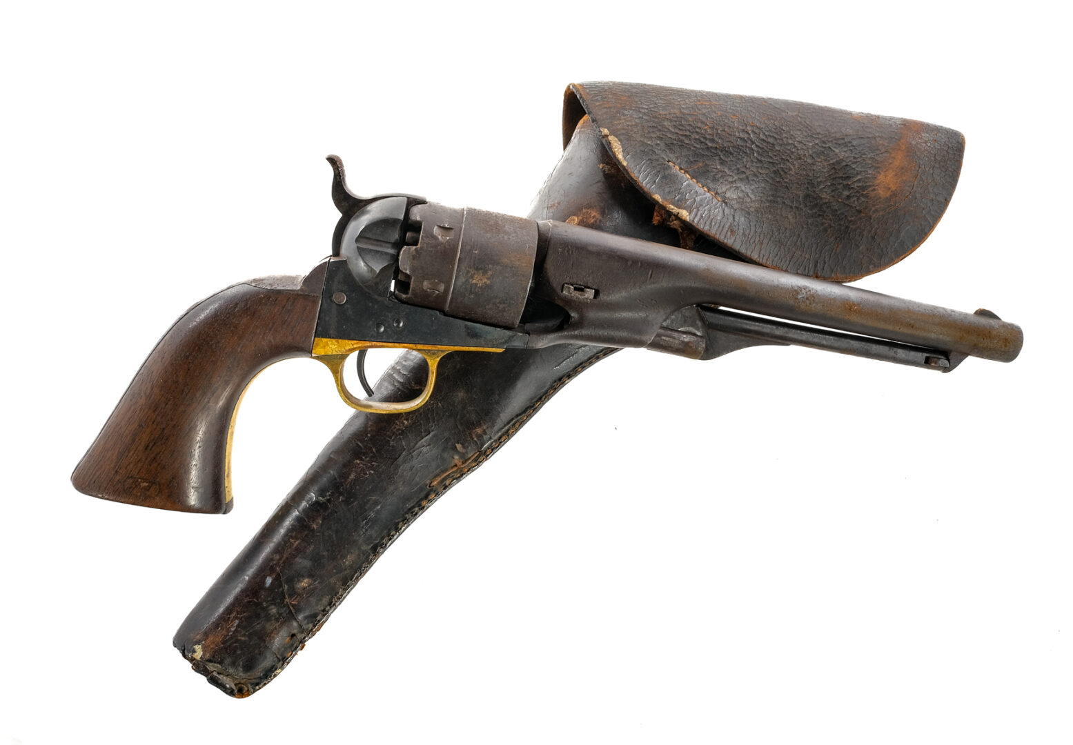 Description Colt Model 1860 Army in .44 caliber with a six round capacity and a 8″ barrel. Smooth wood grip plates. Brass trigger guard. Finish worn blued trigger, hammer, frame, cylinder and barrel. Under barrel ramrod. Front fixed brass blade sight. Comes with its fitted leather belt holster. Underside of rear trigger guard marked: D. Side of cylinder marked: GG H. All visible serial numbers matching except the barrel wedge. Bottom of both grip plates are Martial marked with proofs. Antique, No FFL required and ships to buyers home. Condition: Antique, Very Good with scratches, rust, pitting and finish wear/loss. The rifled bore has rust with visible rifling. Barrel Length: 8″ Serial: 111675 Manufacturer: Colt Year: 1863 Caliber: .44 Model: 1860 Army