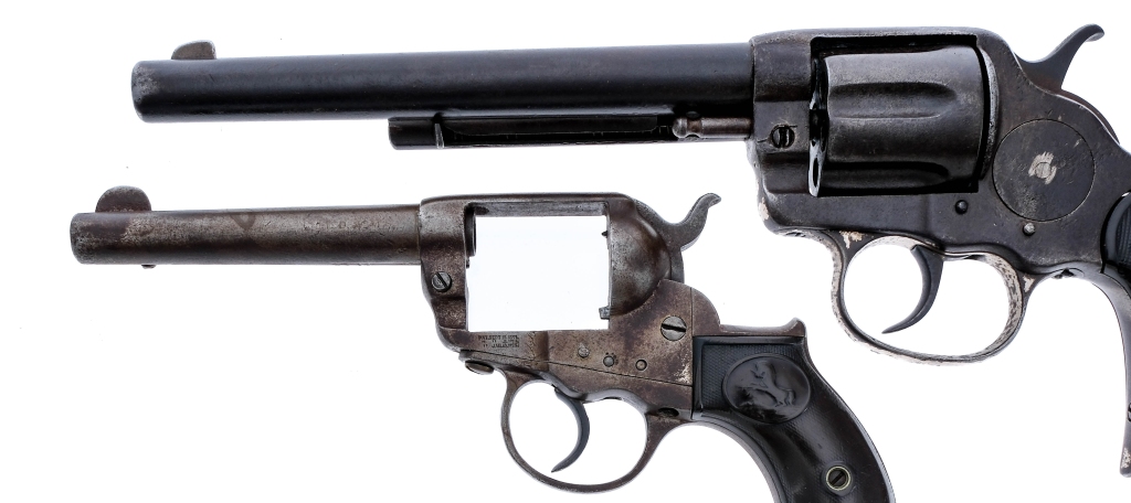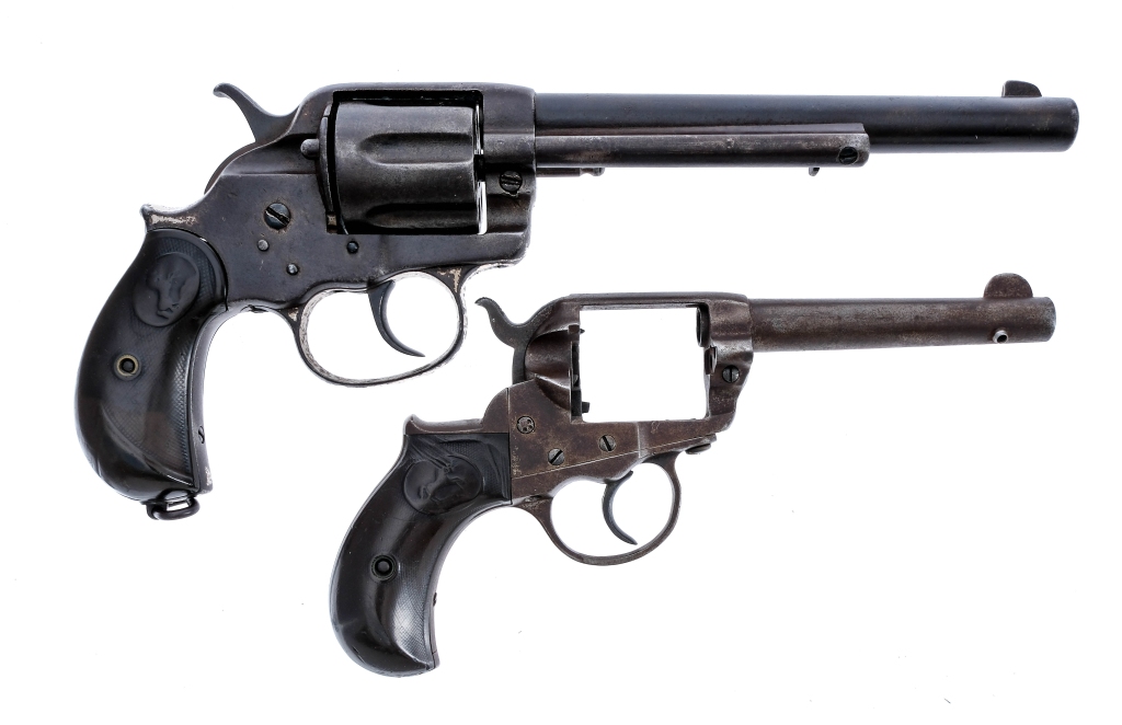 Description This lot is for two Colt Double Action revolvers. Colt Model 1877 Thunderer in .41 Long Colt missing its cylinder with a 4.5″ barrel. Checkered composite grip plates. Finish worn trigger, hammer, frame and barrel. Rear notch and front fixed blade sight. Colt Model 1878 Double Action Frontier Six Shooter in .44-40 Winchester Centerfire with a six round capacity and a 7.5″ barrel. Checkered composite grip plates. Finish worn trigger, hammer, frame, cylinder and barrel. Rear notch and front fixed blade sight. Bottom of frame lanyard loop. Antique, No FFL required and ships to MOST buyers home. Condition: Poor with scratches, finish wear/loss, rust/pitting, broken/missing parts and handling wear. SOLD AS-IS. Barrel Length: 7.5″ 4.5″ Serial: 26329 103285 Manufacturer: Colt Year: 1886 1890 Caliber: .41 LC .44-40 WCF Model: 1878 Frontier Six Shooter 1877 Thunderer