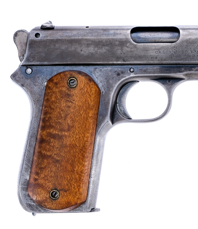 Description Colt 1902 Sporting chambered in .38 ACP with one, seven round removable magazine and a 6″ barrel. Manufactured in 1903 with serial number 5491. Blued steel frame with heel magazine release. Smooth wood grips. Single action trigger and hammer. Patinated blued slide with forward slide serrations. Fixed iron sights. Must ship to a FFL or C&R holder. Condition: Fair with scratches, contact marks, and general handling wear. Most of the finish is in the white with varying spots of patina and metal oxidation. Light scratches and wear on the grips. The rear sight notch has been cut to be deeper. The action is a bit sticky. The bore is decently bright with good visible rifling, some spots of rust in the rifling. Barrel Length: 6″ Serial: 5491 Manufacturer: COLT Year: 1903 Caliber: .38 ACP Model: 1902 Sporting Book# 05670
