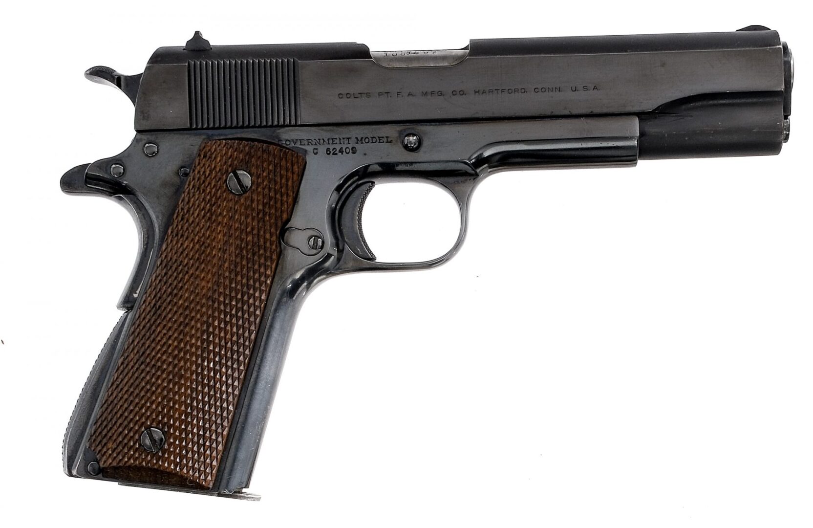 Description Colt 1911 Government Model in .45 ACP with three, seven round removable magazines and a 5″ barrel. Checkered wood grip plates. Blued frame, checkered solid trigger, checkered hammer and serrated slide. Backstrap safety. Lower left side of frame checkered magazine release. Left side of frame slide release and slide stop safety. Front and rear fixed sights. Pistol comes set up with Natural Match barrel marked: NM 7267717 Colts Mfg Co 1081897. Comes in Colt box unmarked with three .45 magazines, Colt .38 Super slide, Colt Super .38 Auto MK IV Series 70 barrel and three, .38 Auto magazines. Must ship to a C&R or FFL holder. Condition: Good with, scratches, handling wear and the pistol being refinished. The rifled bore on the .45 has rust with visible rifling. The .38 Super barrel has a clean rifled bore. Barrel Length: 5″ Serial: 62409 Manufacturer: Colt Year: 1916 Caliber: .38 Super Model: 1911 Government Model Book# 03123