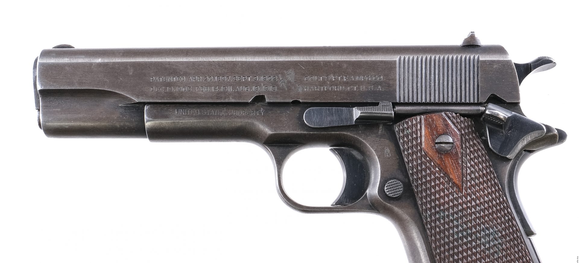 Description Colt 1911 U.S. Army “Black Army” in .45 caliber with one, seven round removable magazine and a 5″ barrel. Checkered wood grip plates. Dark Blued finished frame, solid trigger, checkered hammer and serrated slide. Backstrap safety. Lower left side of frame checkered magazine release button. Left side of frame serrated action release and slide stop safety. Front and rear fixed sights. Left top side of frame marked: United States Property. Lower left side of frame marked: S8. Top of frame marked: G H0 8 7 6. Bottom of the magazine lip is marked: L. Inside of slide marked: O 04. Rear of slide under firing pin retainer marked: H 8. Newer Colt barrel marked: Colt 45 Auto. Must ship to a C&R or FFL holder. Condition: Good/Very Good with finish wear/loss, wood dings and handling wear. Clean rifled bore. Barrel Length: 5″ Serial: 360818 Manufacturer: Colt Year: 1918 Caliber: .45 ACP Model: 1911 US Army Book# 496