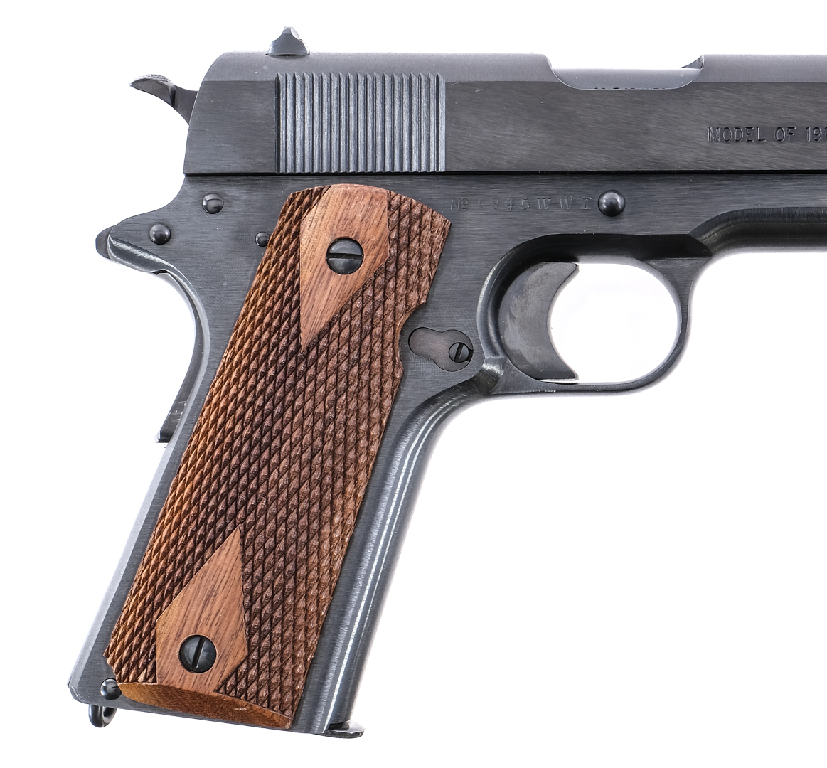 Description Colt 1911 U. S. Army United States Property marked in .45 caliber with one, seven round removable magazine and a 5″ barrel. This is a Reproduction made by Colt of the WWI 1911 pistol. Checkered diamond wood grip plates. Black Oxide finished frame, solid trigger, checkered hammer, serrated slide and barrel. Magwell located lanyard loop. Backstrap safety. Lower left side of frame checkered magazine release button. Left side of frame slide release and slide stop safety. Front and rear fixed sights. Roll marked with all the same proofs as the original WWI model. Must ship to a FFL holder. Condition: Very Good/Excellent with light scratches and handling wear. Clean rifled bore. Barrel Length: 5″ Serial: 1245WWI Manufacturer: Colt Caliber: .45 Model: 1911 Book# 10-682