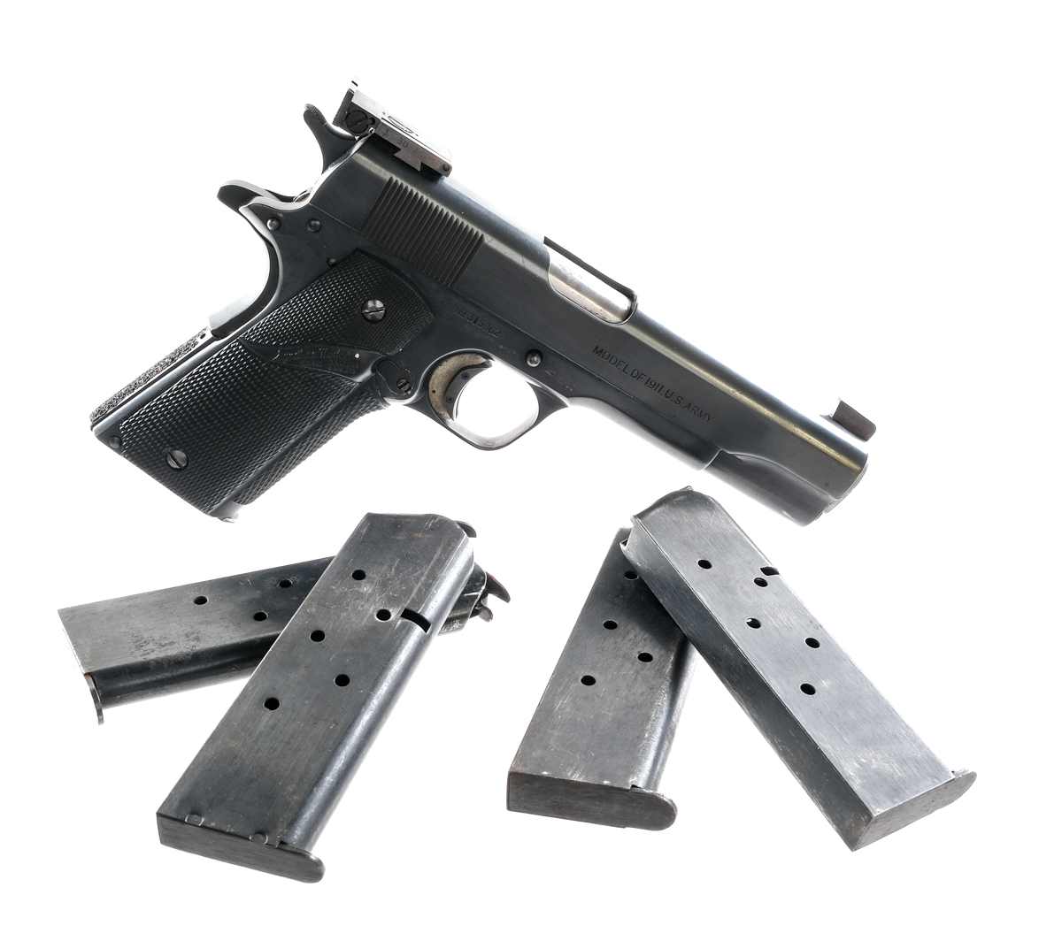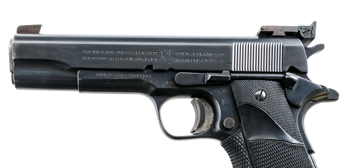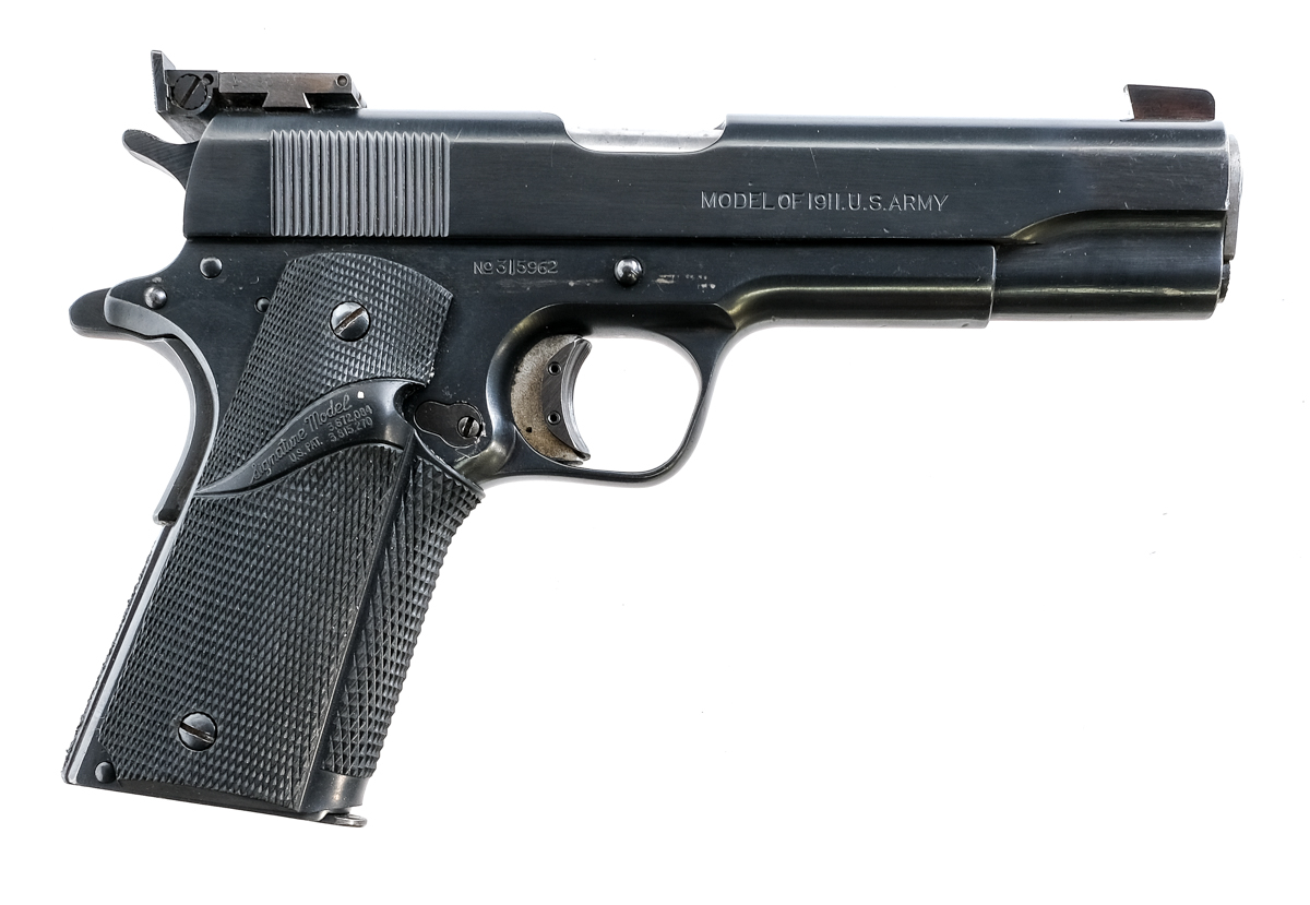 Description US Property Colt 1911 US Army in .45 caliber with one, seven round removable magazine and a 5″ barrel. Checkered Pachmayr rubber grip plate. Blued frame, checkered hammer and serrated slide. Trigger with blued aftermarket serrated extension. Left side of frame checkered magazine release button, slide release and slide stop safety. Backstrap safety. Rear adjustable and front fixed blade sight. MP marked barrel. Comes with five blued magazines and a soft nylon carry case. Must ship to a C&R or FFL holder. Condition: Good with the pistol being refinished, finish wear and aftermarket parts. Aftermarket dimpled front and backstrap. Clean rifled bore. Sold AS-IS. Barrel Length: 5″ Serial: 315962 Manufacturer: Colt Year: 1918 Caliber: .45 ACP Model: 1911 Book# 9-628